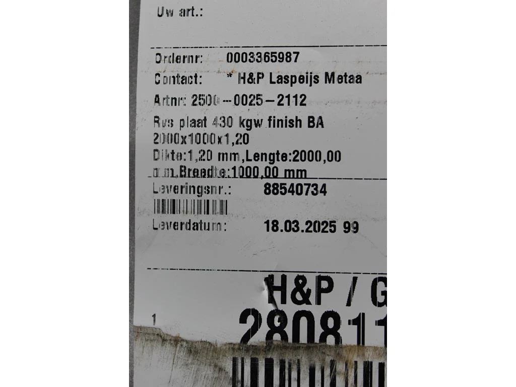 27 RVS platen 430kwg finish VA met afmeting 2000 x 1000 x 1,2 mm.