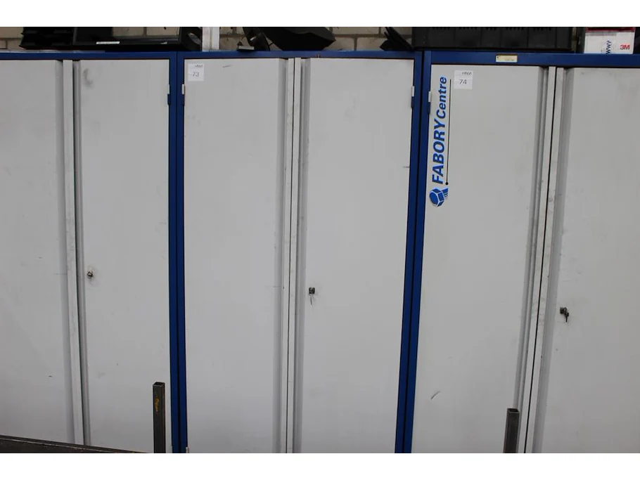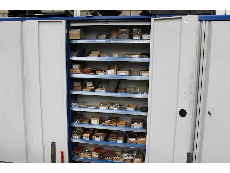 Magazijnkast gevuld met bevestigingsmaterialen w.o. bouten, moeren en ringen in diverse afmetingen. Kastafmeting 100 x 37 x 198 cm.