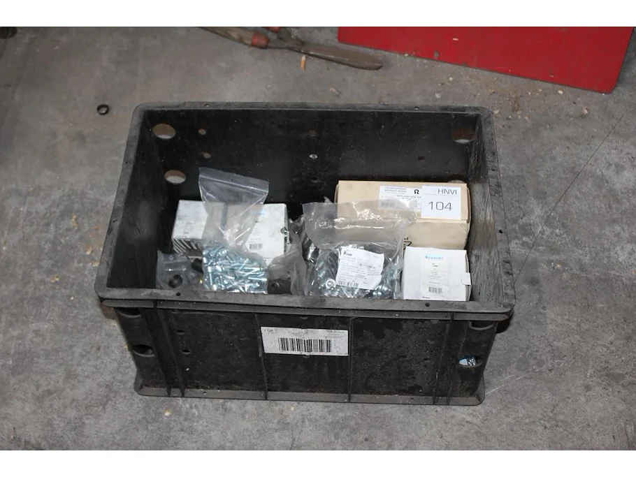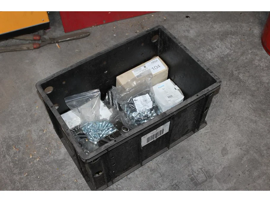 Bevestigingsmaterialen w.o. cilinderschroeven, revetten, moeren en plungers in kunststof krat.