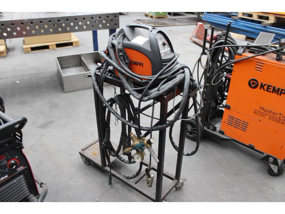 TIG lasapparaat KEMMPI MinArc TIG 180 met toorts en manometers op verrijdbaar statief.