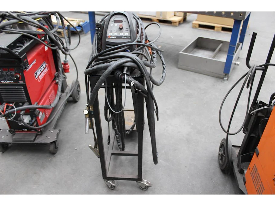 Tig lasapparaat kemmpi minarc tig 180 met toorts en manometers op verrijdbaar statief.