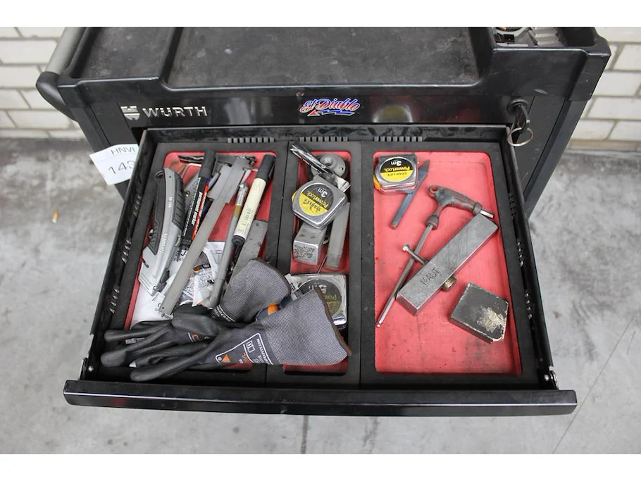 Gereedschapswagen WURTH gevuld met divers gereedschap w.o. hamers, vijlen, steeksleutels, tangen, inbus, schroevendraaiers, etc.