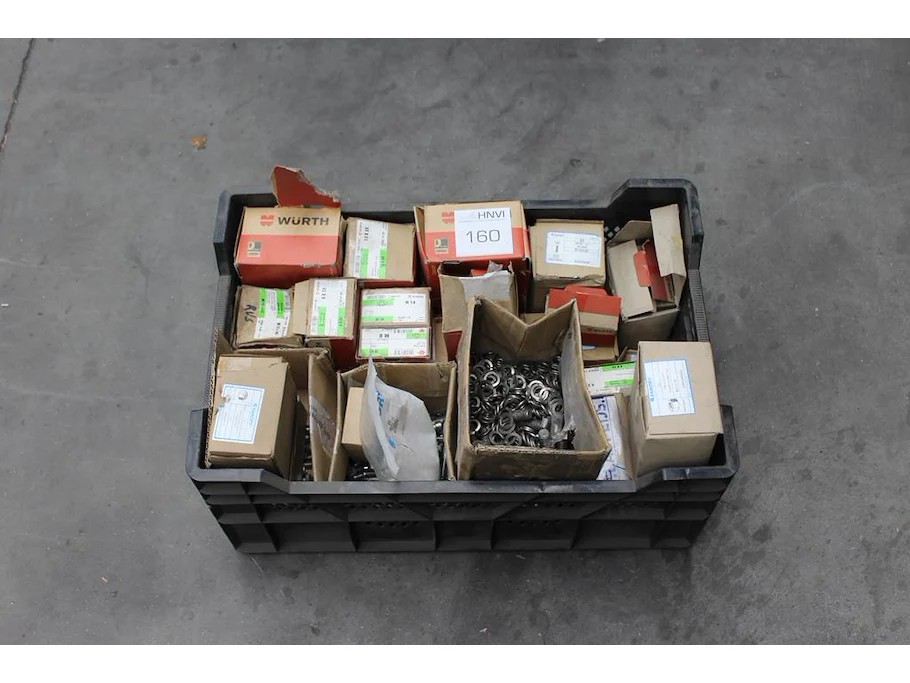 Bevestigingsmaterialen w.o. boeten, moeren en ringen w.o. rvs in kunststof krat.