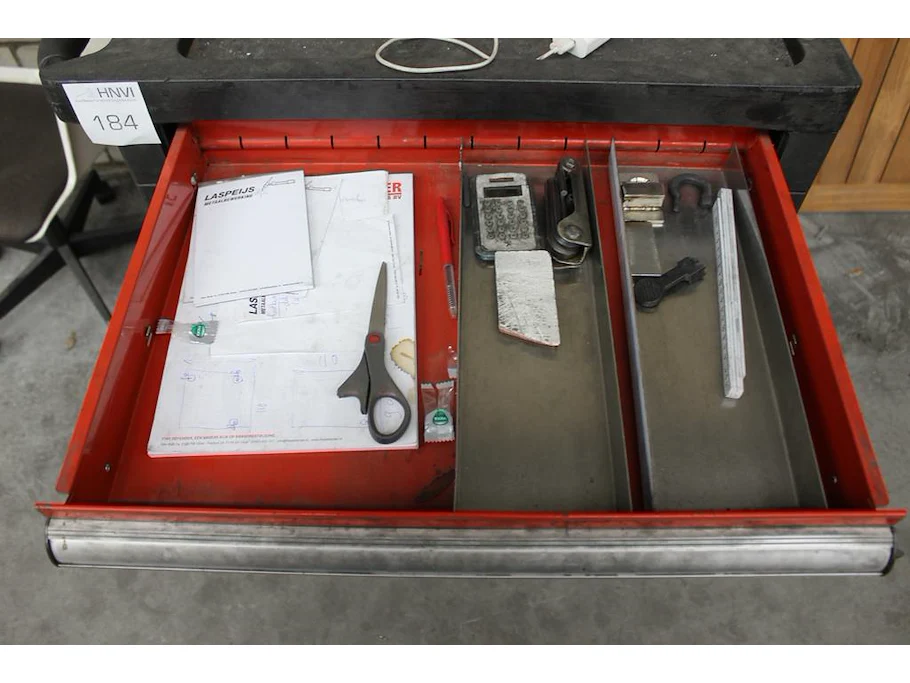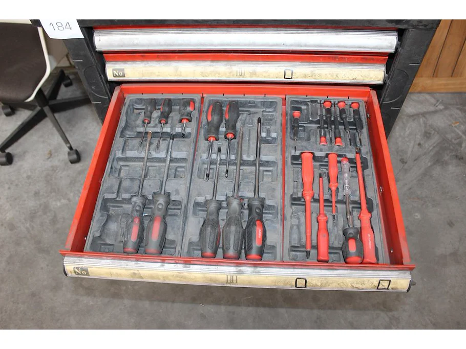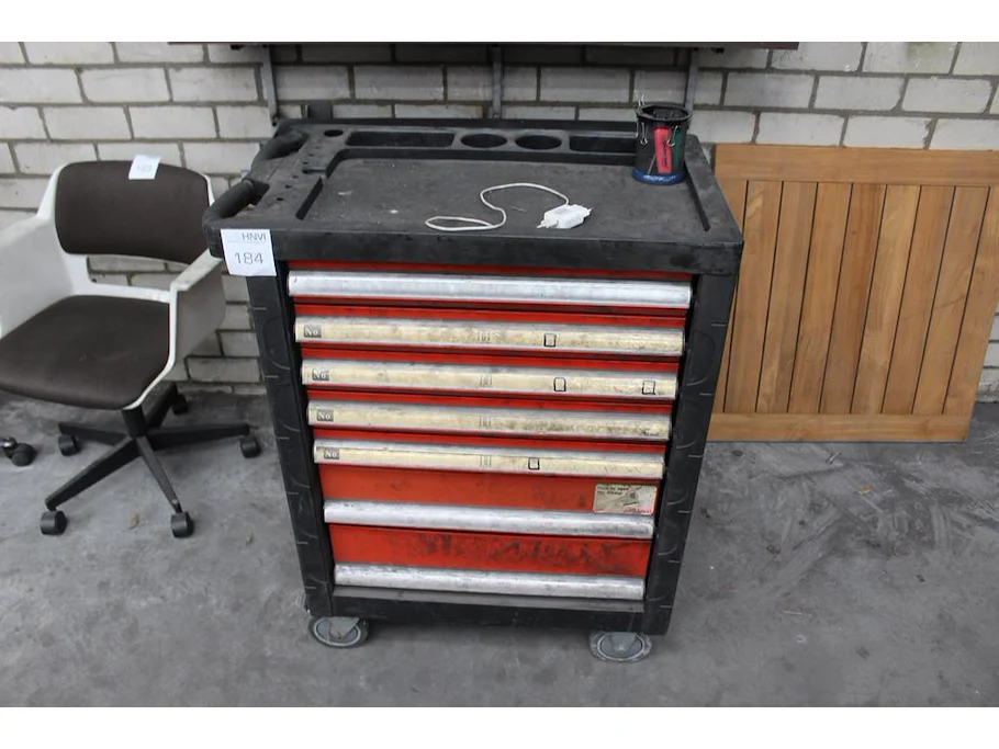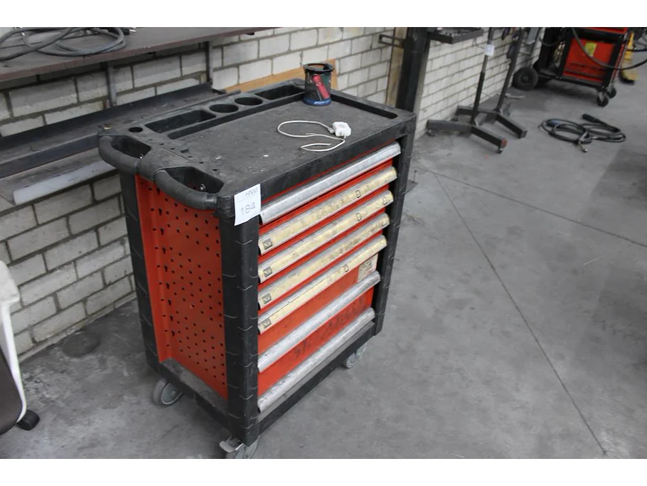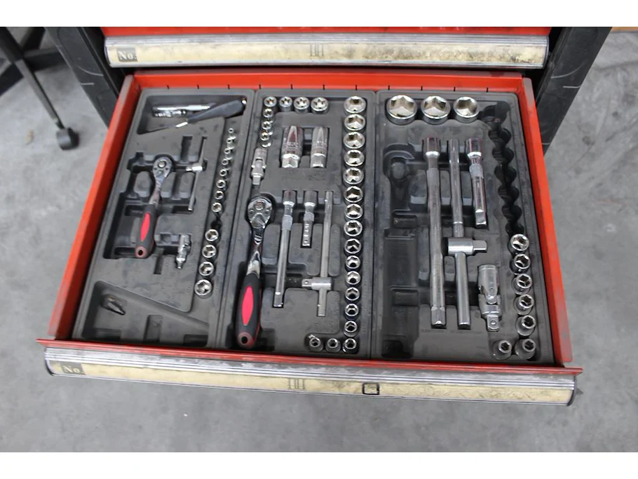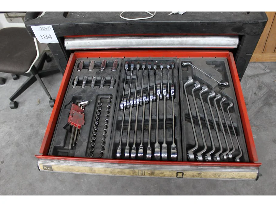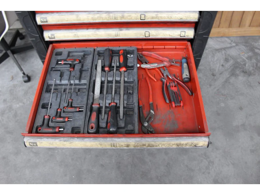 Gereedschapswagen met ring-ratelset, dopsleutelset, schroevendraaiers, inbus, tangen, veilen, bahco's.