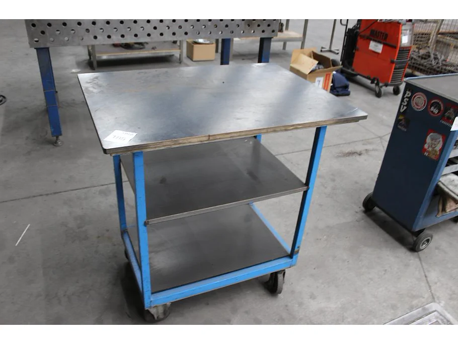 Verrijdbare werktafel met onderplateaus en afmeting 95 x 70 x 78 cm.