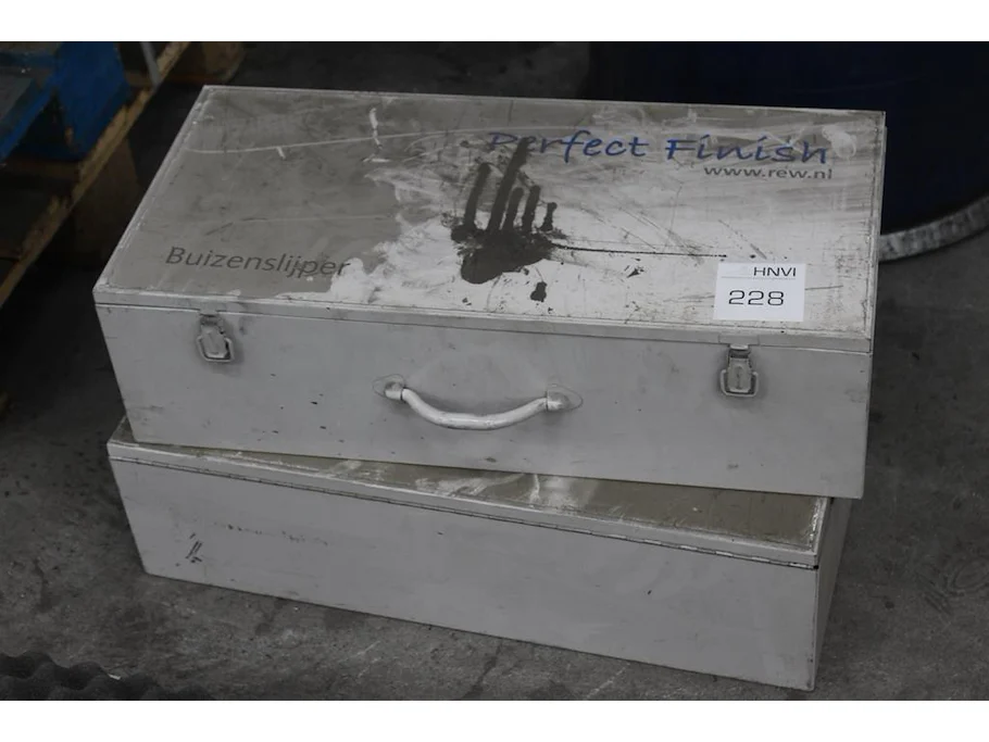 Twee metalen machinekisten met afmeting 64 x 31 x 18 cm.