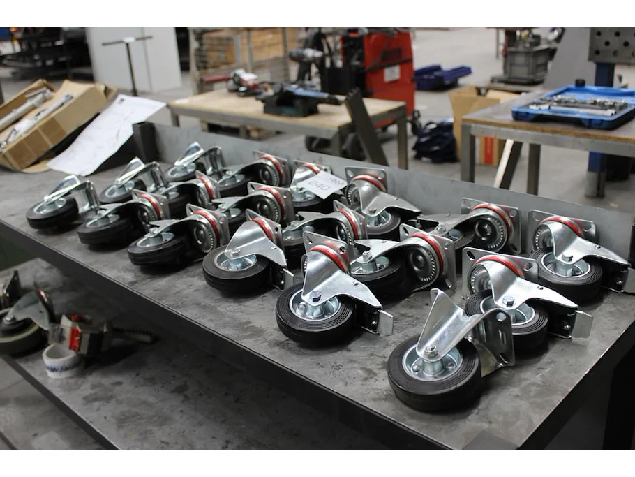 Achttien rubber wielen w.o. 14 zwenkwielen.
