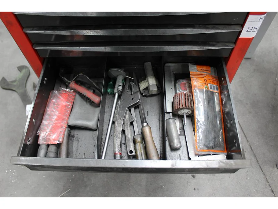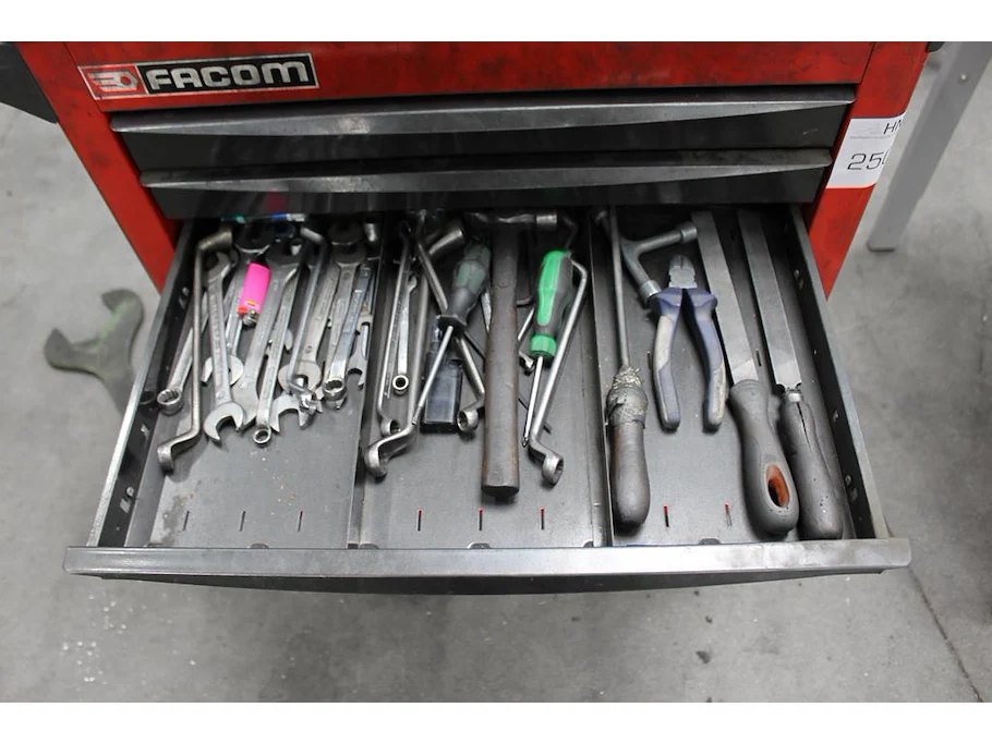 Gereedschapswagen FACOM Chrono 5 gevuld met divers gereedschap w.o. vijlen, sleutels, schroevendraaiers, tangen, etc.