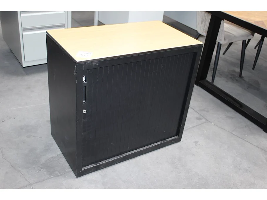 Archiefkast met houten topblad en roldeur. afmeting 80 x 45x 75 cm.