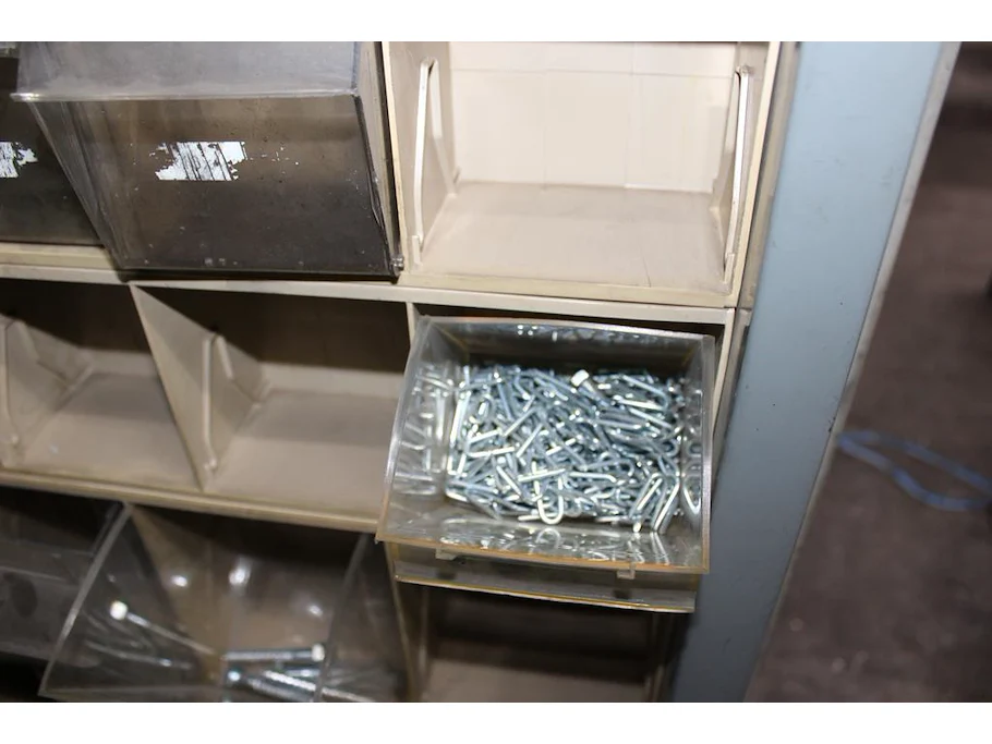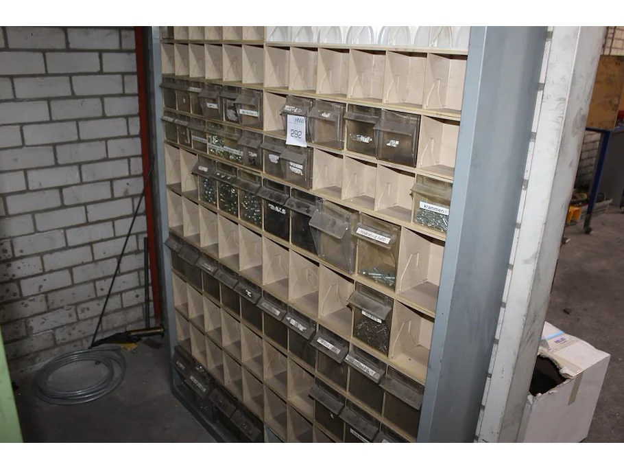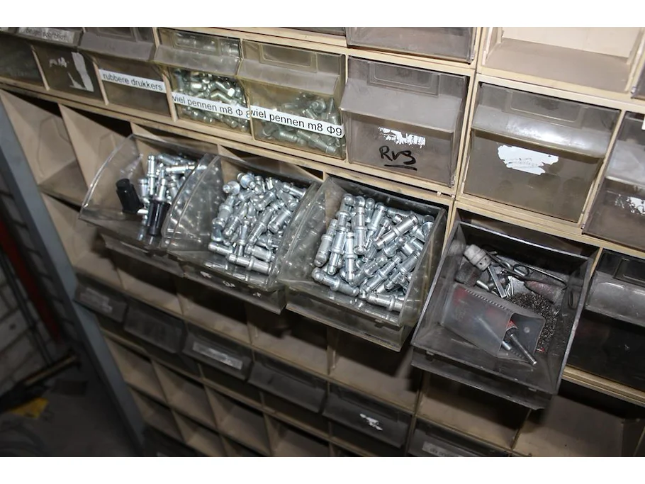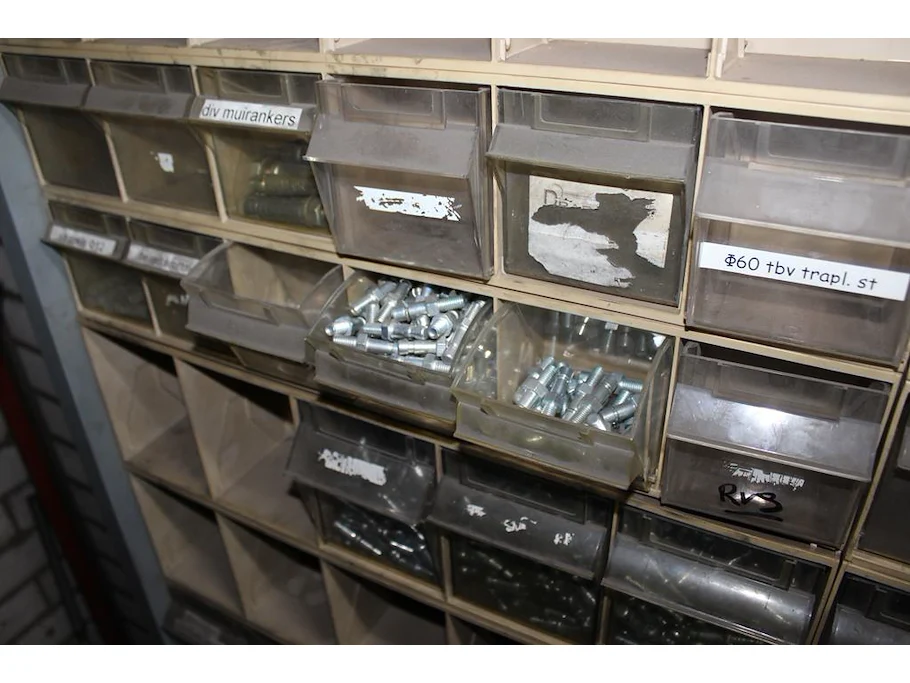 Bevestigingsmaterialen in voorraadkast waaronder wielpennen, muurankers, bouten en krammen