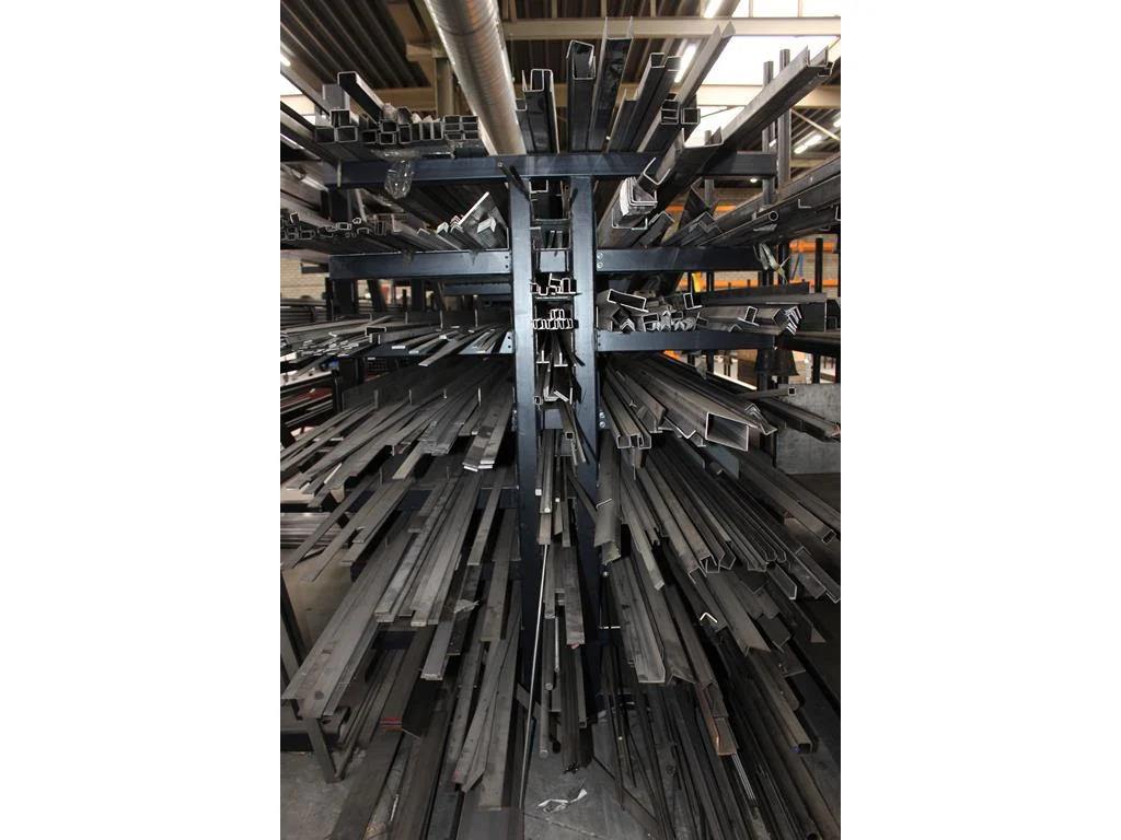 Dubbelzijdige draagarmstelling in drie staanders met zeven armen circa afm. 500 x 150 x 204 CM, ophalen in overleg met HNVI