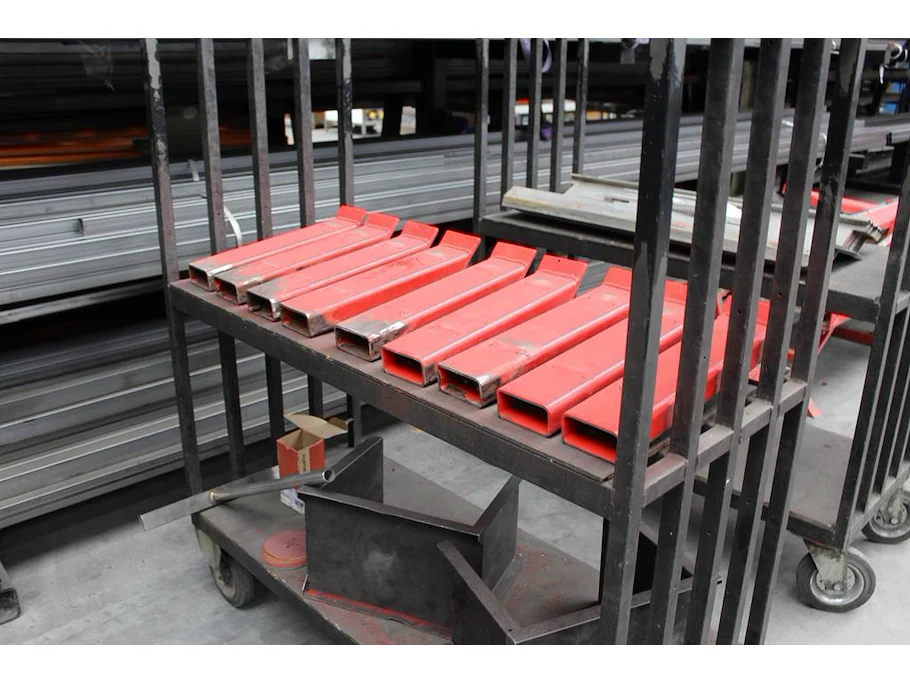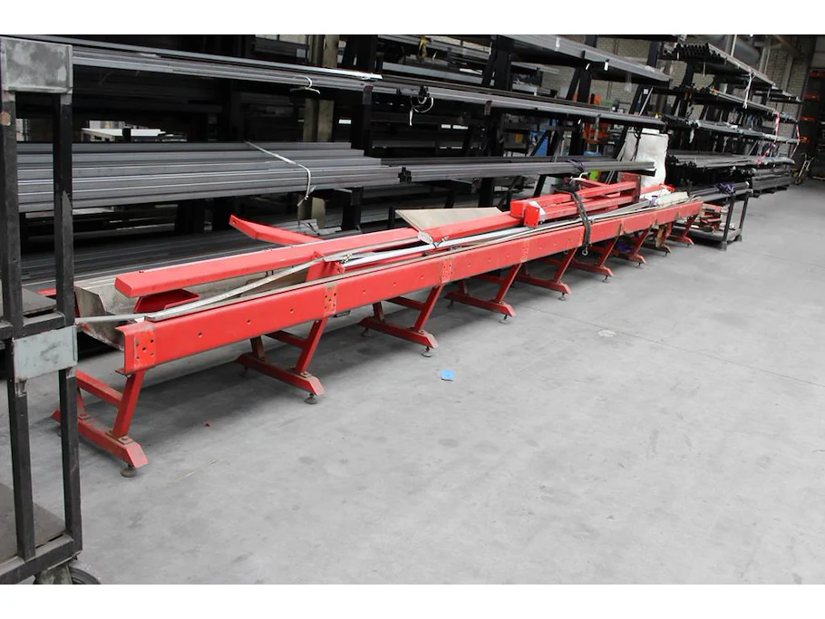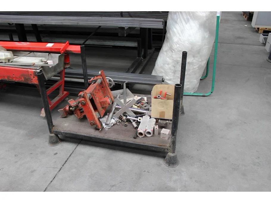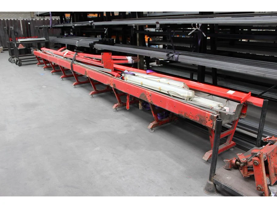 Gedemonteerde richtbank met grote hoeveelheid onderdelen, compleetheid onbekend, lengte circa 8 M