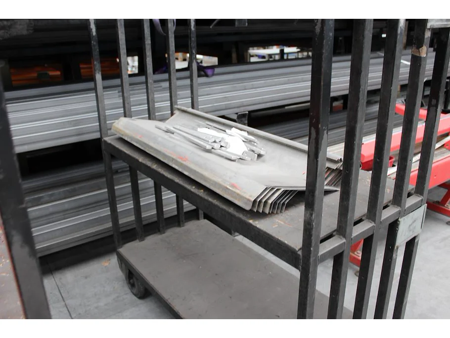 Gedemonteerde richtbank met grote hoeveelheid onderdelen, compleetheid onbekend, lengte circa 8 m