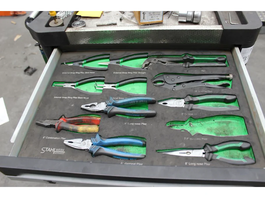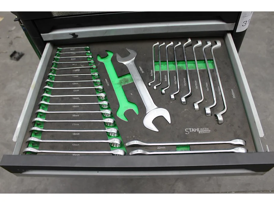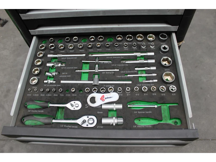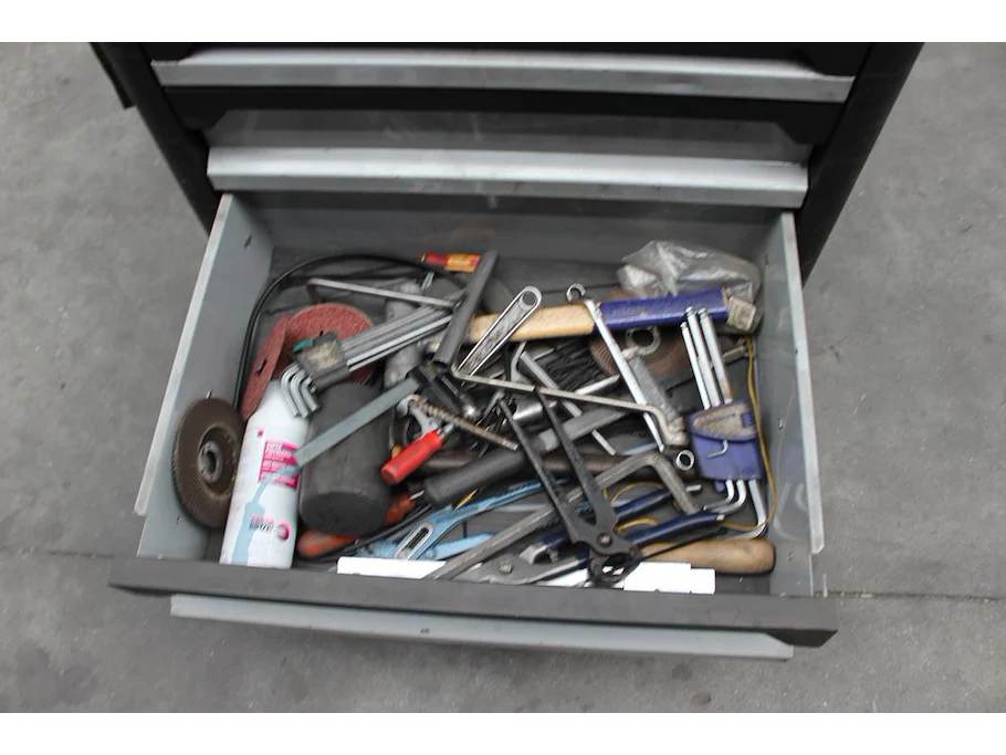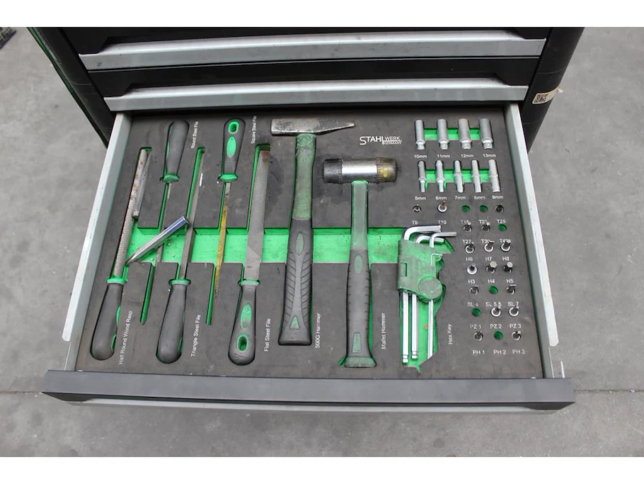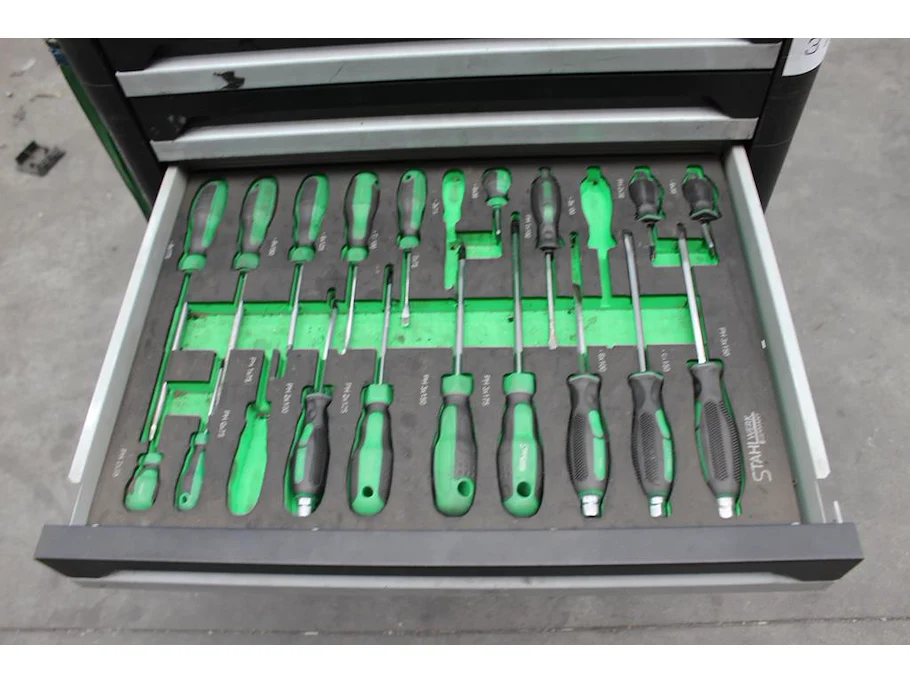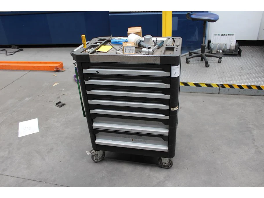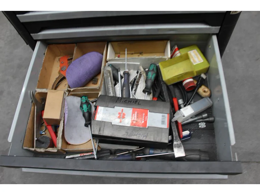 Verrijdbare gereedschapswagen met tangen, schroevendraaiers, sleutels, doppenset, boren, hamers enz.