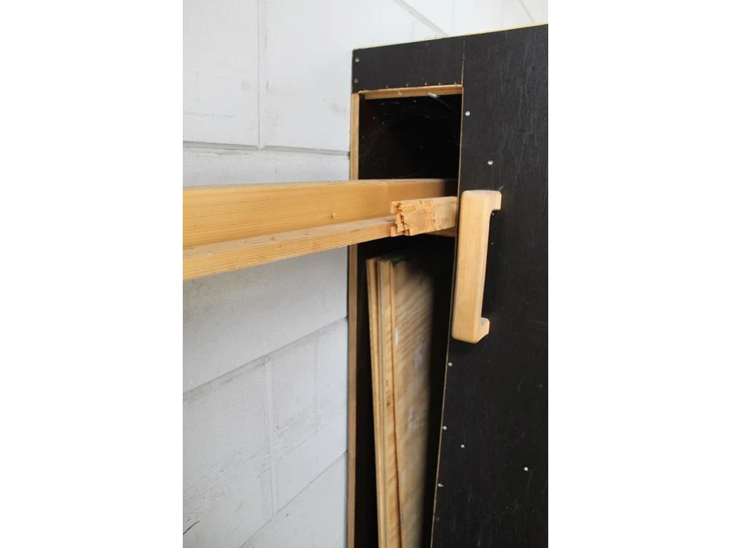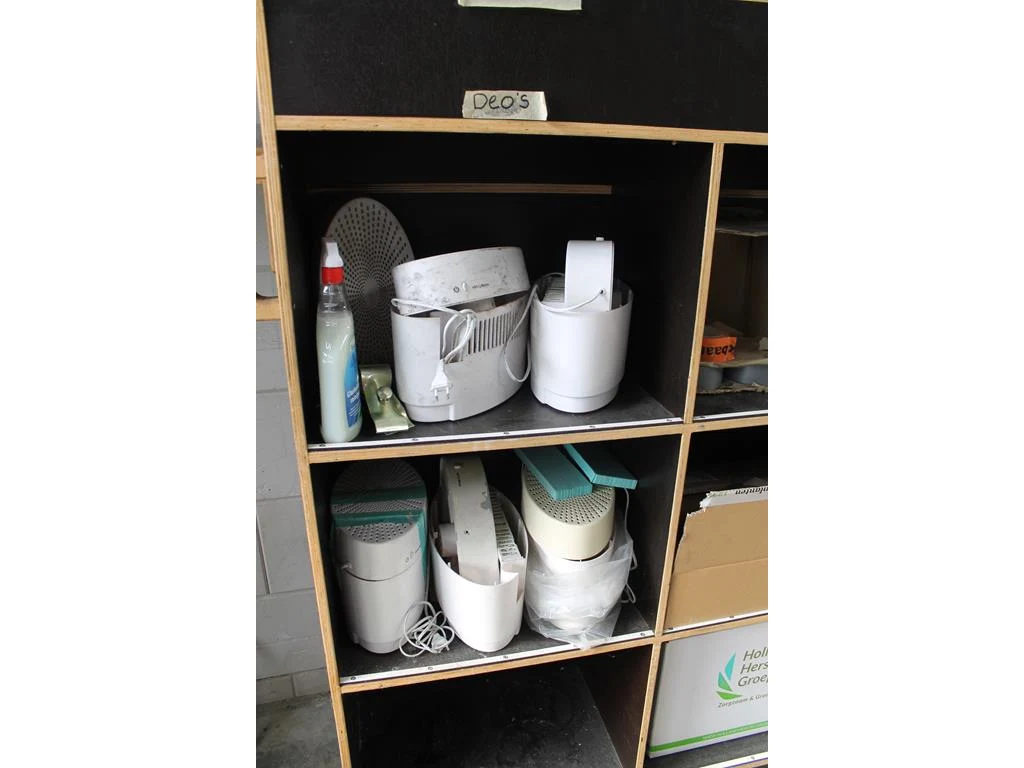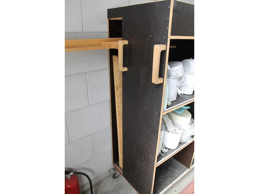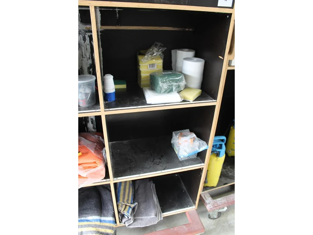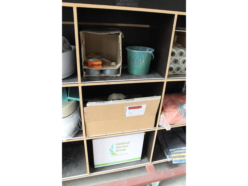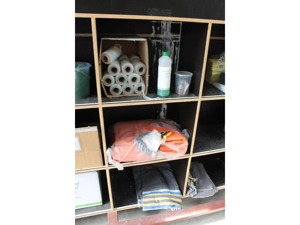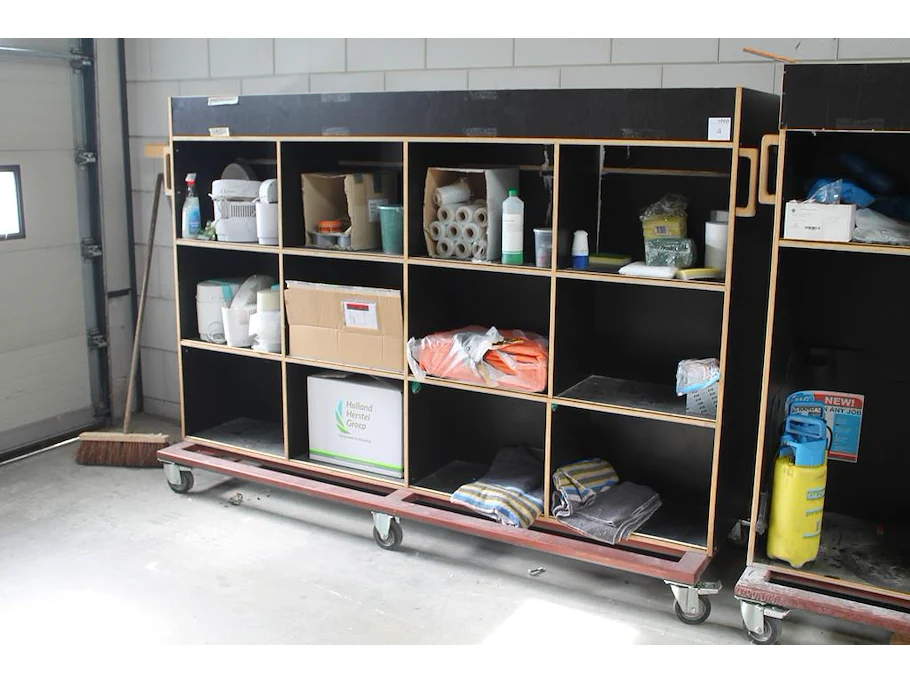 Verrijdbare salvagekast gevuld met zeil, tape, sealproducten, luchtbevochtigers, poetsproducten, houten platen en verhuisdekens. Afmeting 250 x 80 x 180 cm.