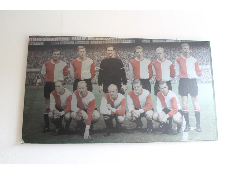 Foto op hout feijenoord. afmeting 185 x 102 cm. vermoedelijk elftal foto uit het kampioensjaar 1961.
