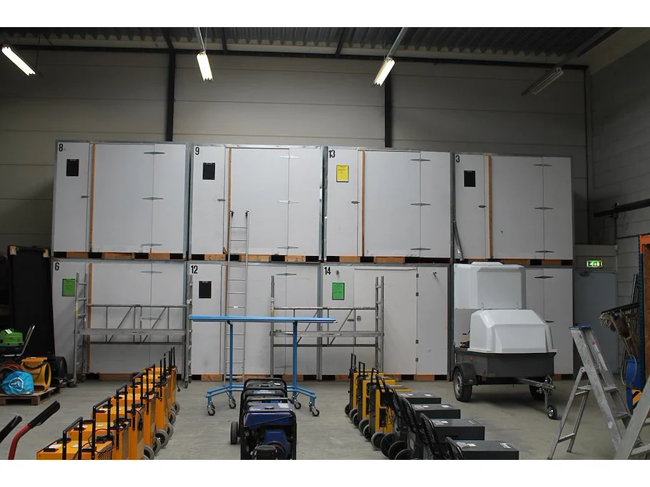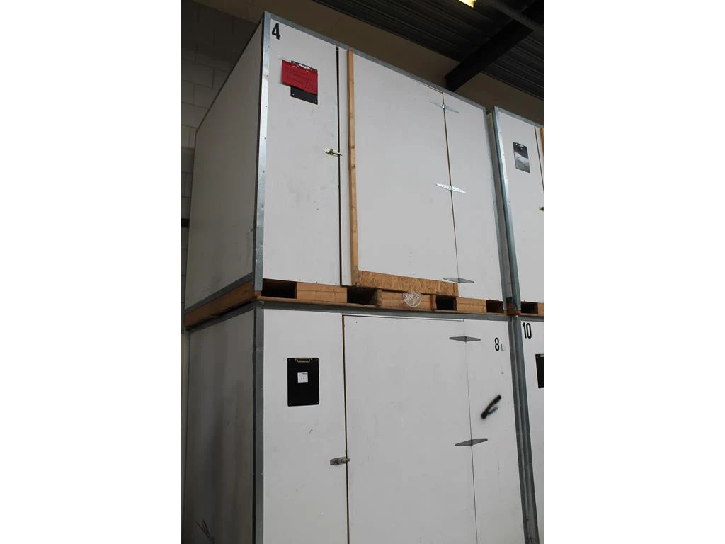 20 opslagboxen met lepelgaten en afmeting 250 x 210 x 222 cm. Let op: ophalen in overleg.