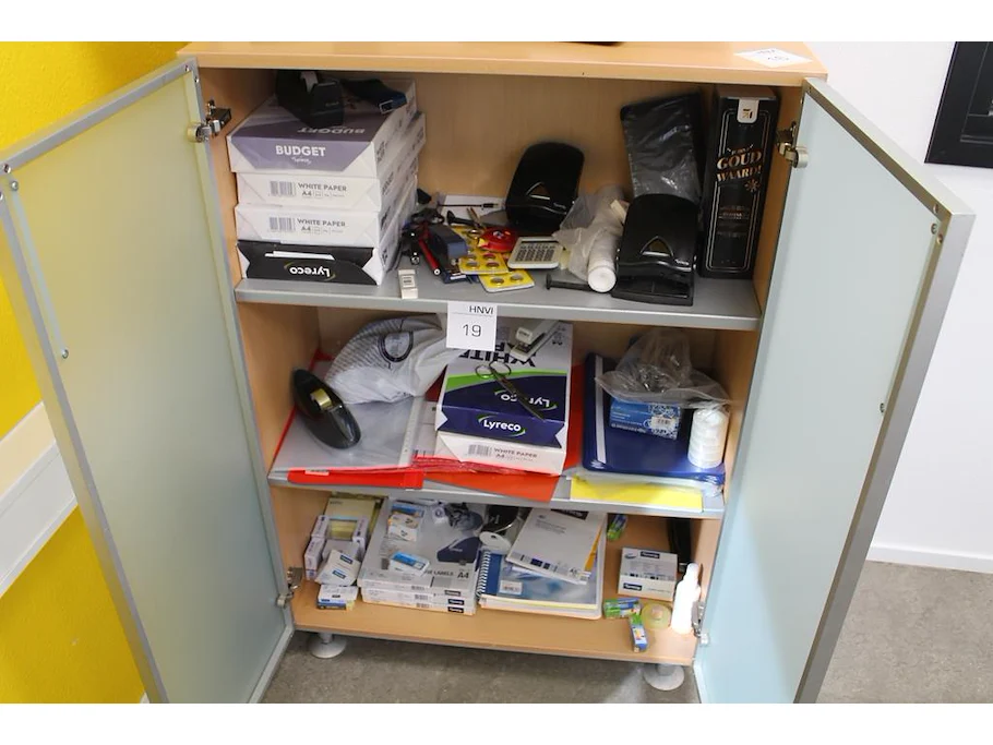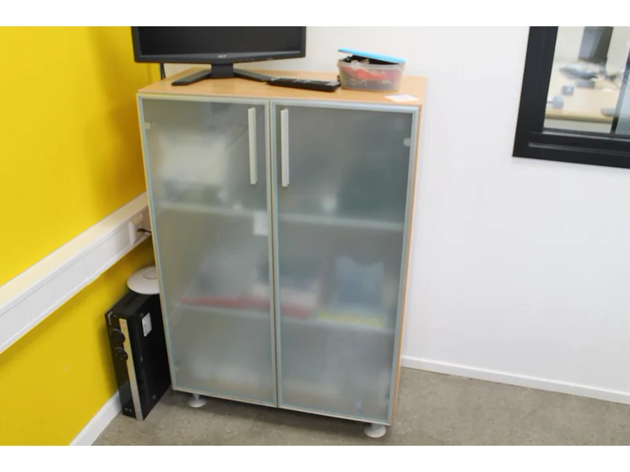 Archiefkast met melkglazen deuren. Afmeting 80 x 42 x 117 cm. Let op: exclusief inhoud.