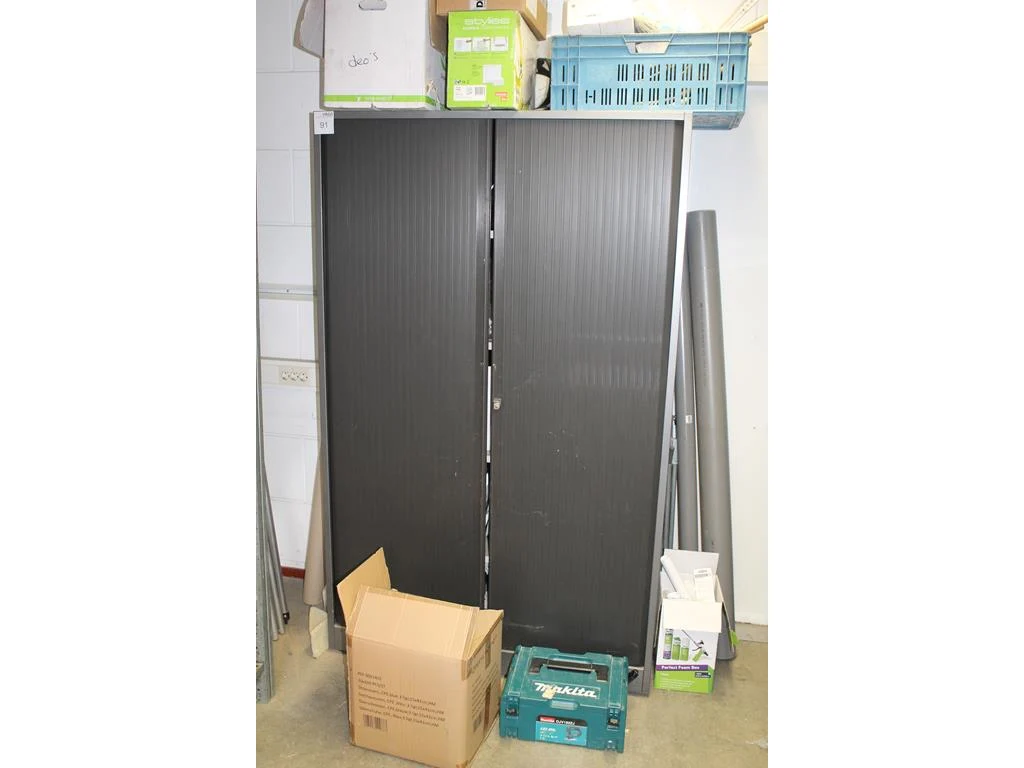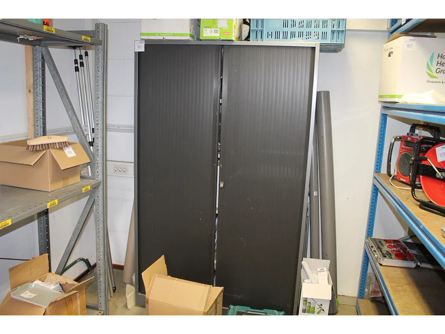 Magazijnkast met 2 roldeuren en afmeting 120 x 45 x 195 cm. let op: exclusief inhoud en ophalen na 13.00u.
