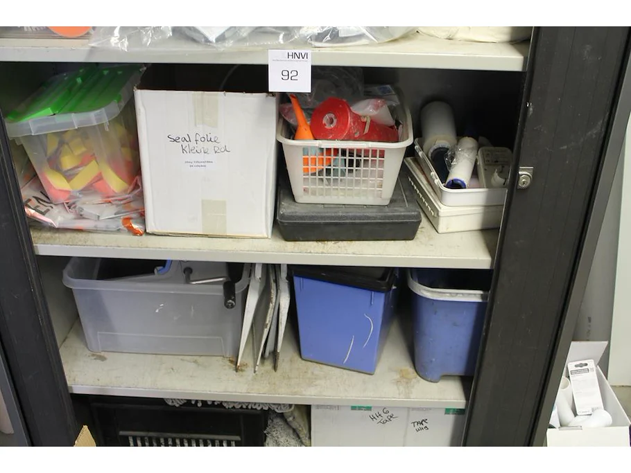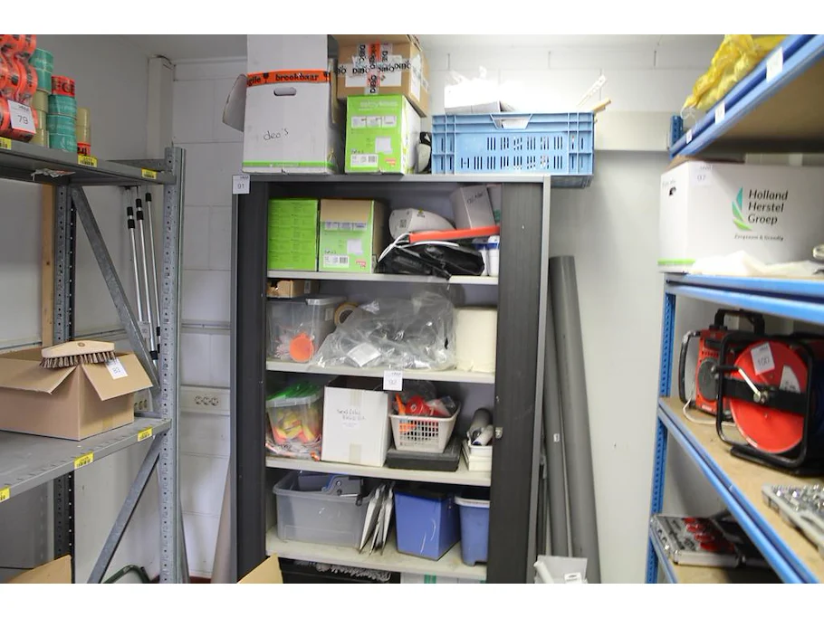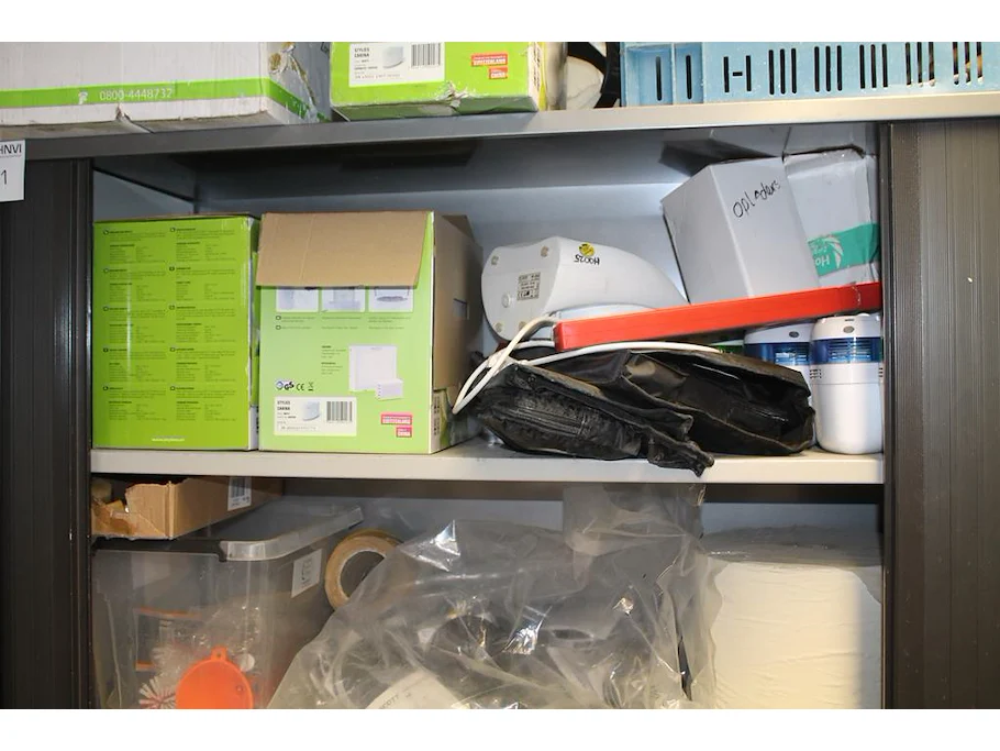 Salvage producten w.o. persoonlijke beschermingsmiddelen, sealproducten, moppen, tape en luchtverfrissers en zuiveraars in kast.