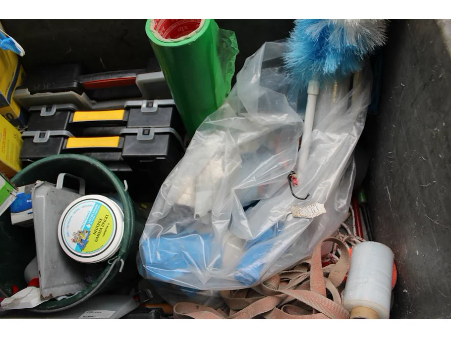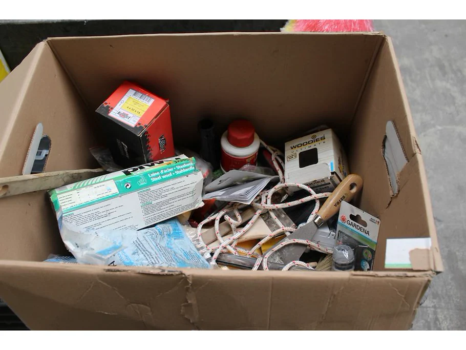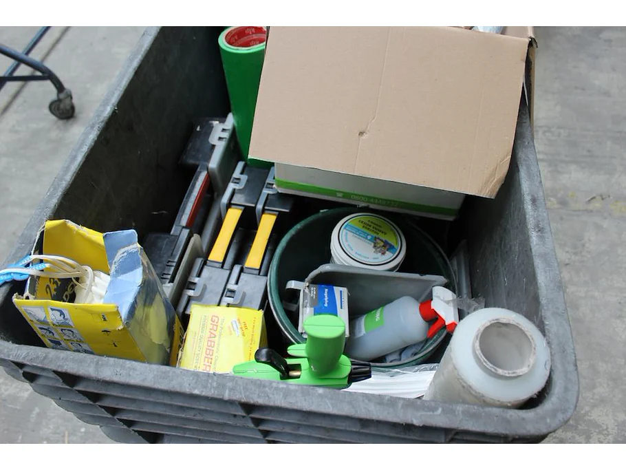 Verrijdbare accubak gevuld met diverse gereedschappen en reinigingsmiddelen.