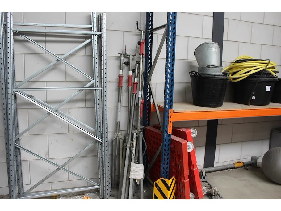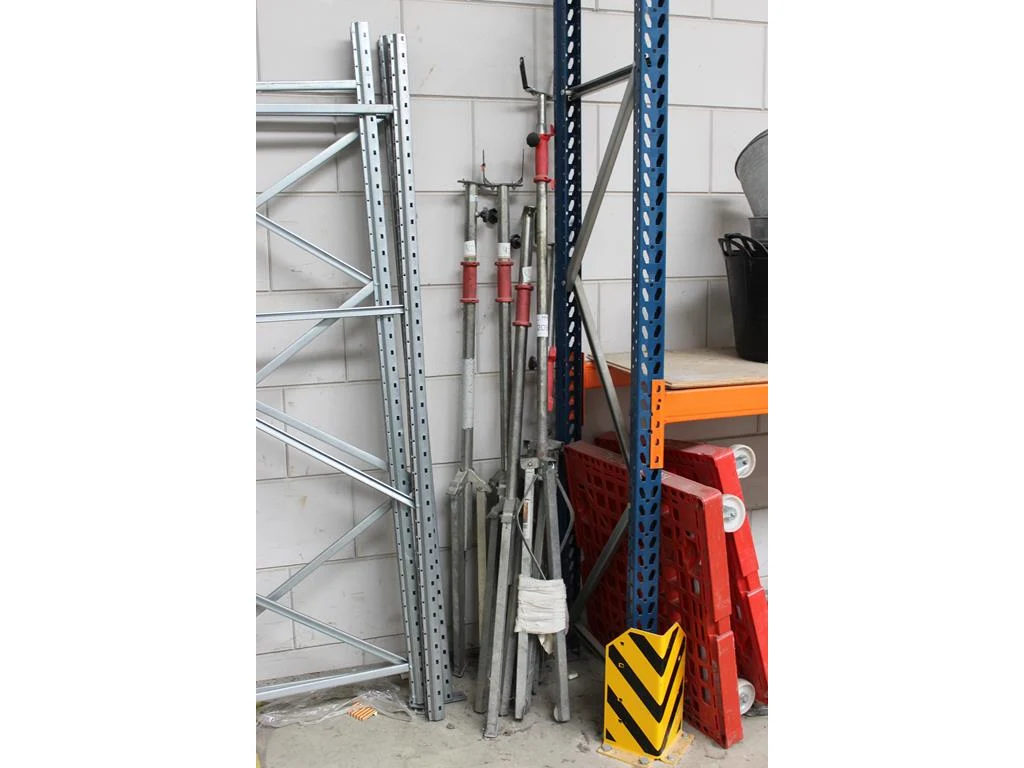 Vijf bouwlampstatieven, in hoogte verstelbaar.