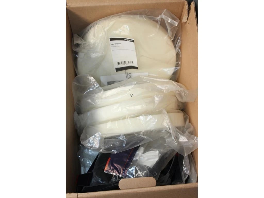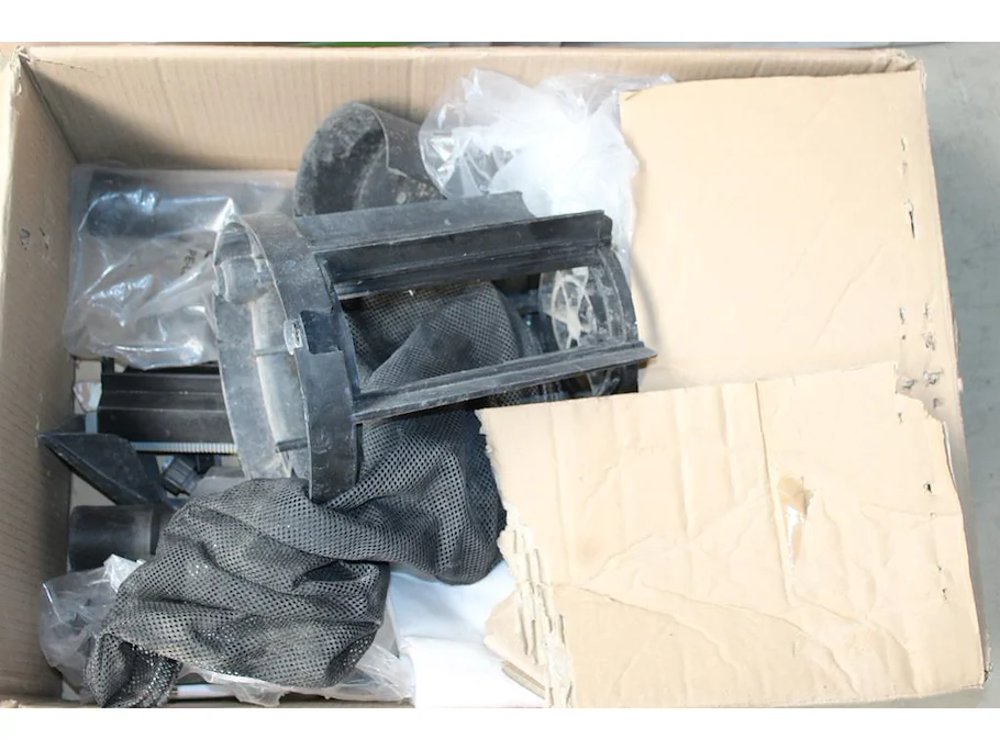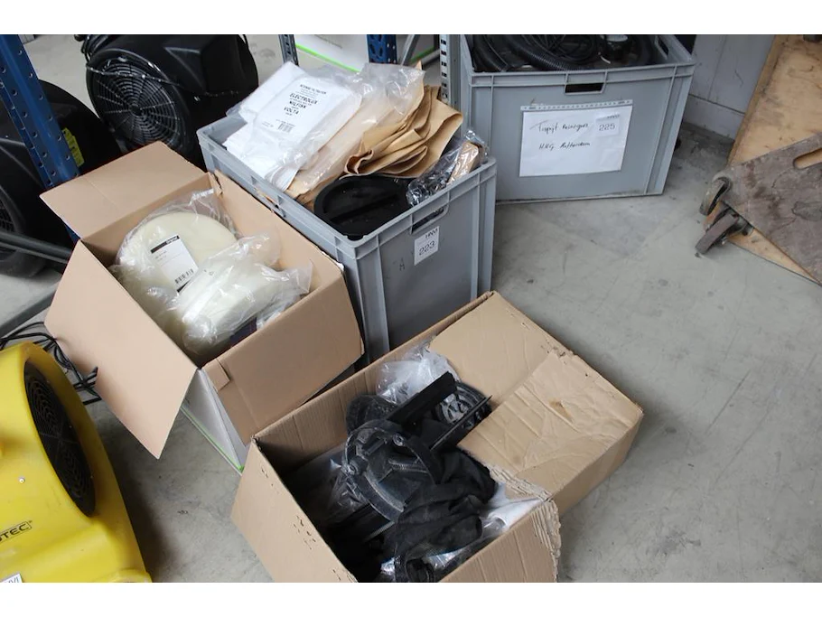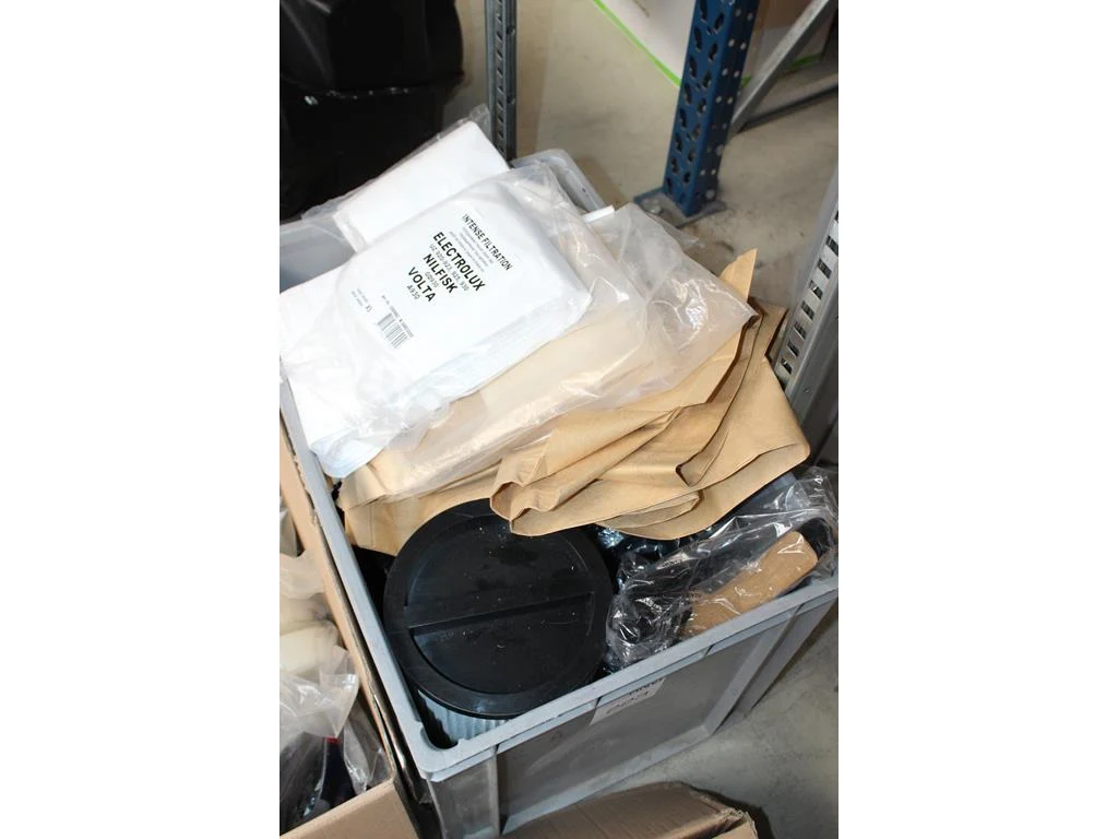 Stofzuiger-onderdelen en -zakken in kunststof krat.