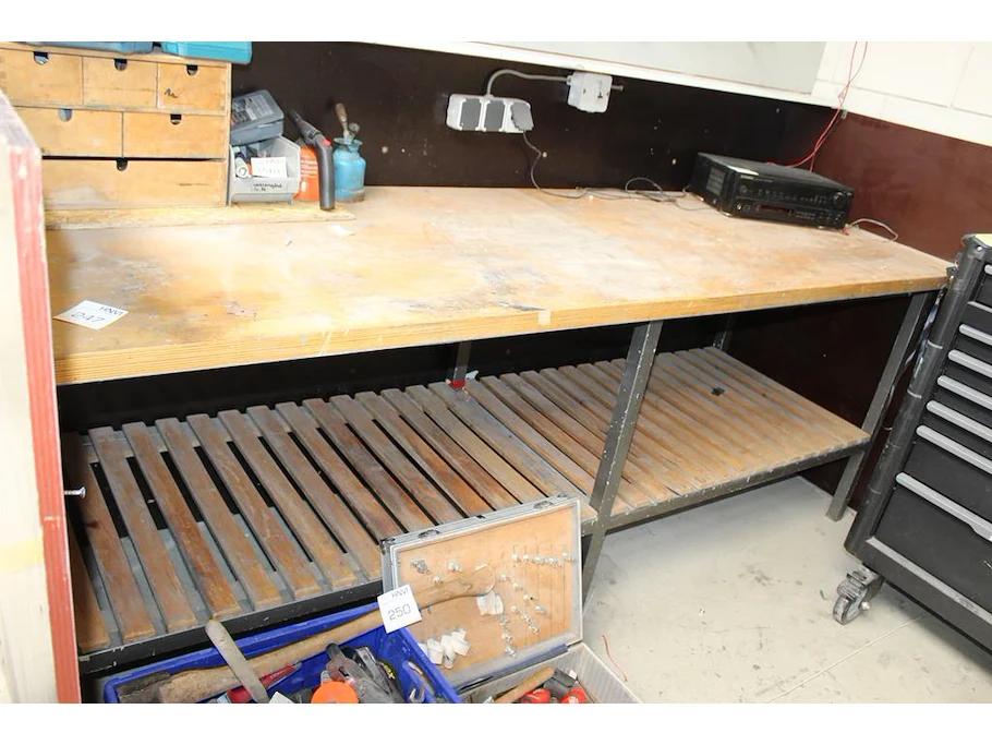 Werkbank met onderplateau. afmeting 250 x 80 x 90 cm. let op: exclusief gereedschappen op de bank.