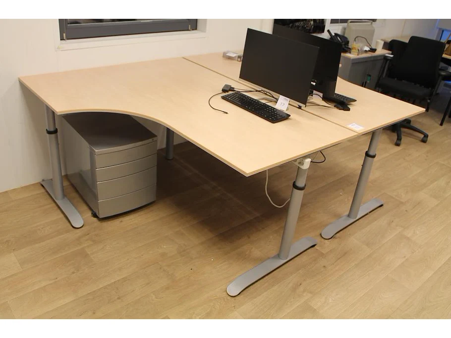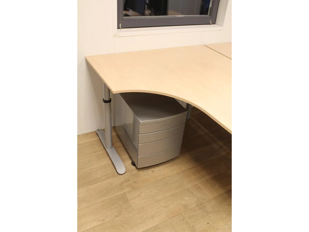 Twee in hoogte verstelbare houten hoekbureaus 160 x 120 cm met twee verrijdbare ladekasten met vier laden.