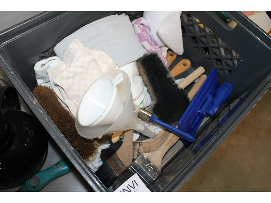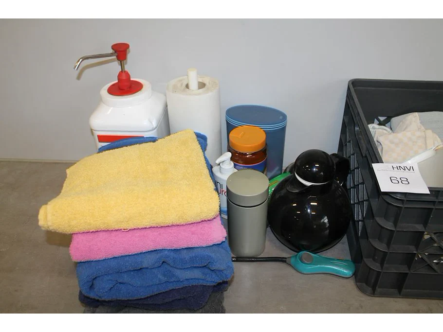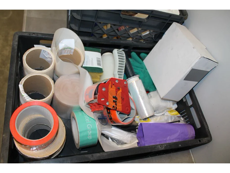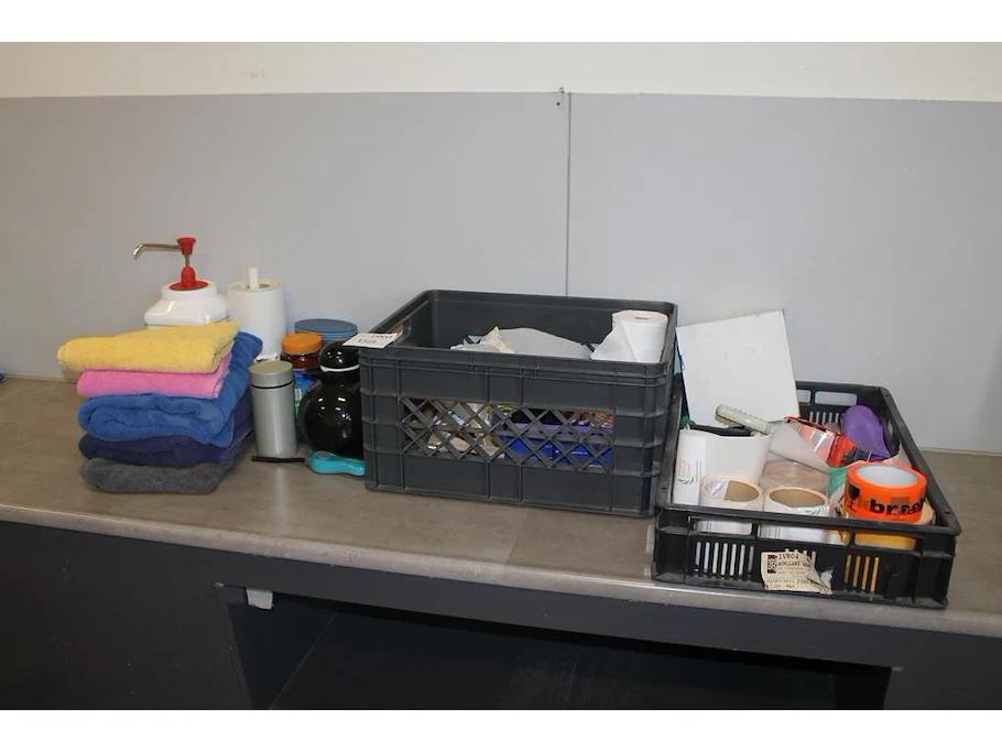 Schoonmaak- en keukenproducten, waaronder handdoeken, kwasten, koffieproducten, zeep, tape, afzetlint, vuilniszakken, enz. in en om kunststof kratten.