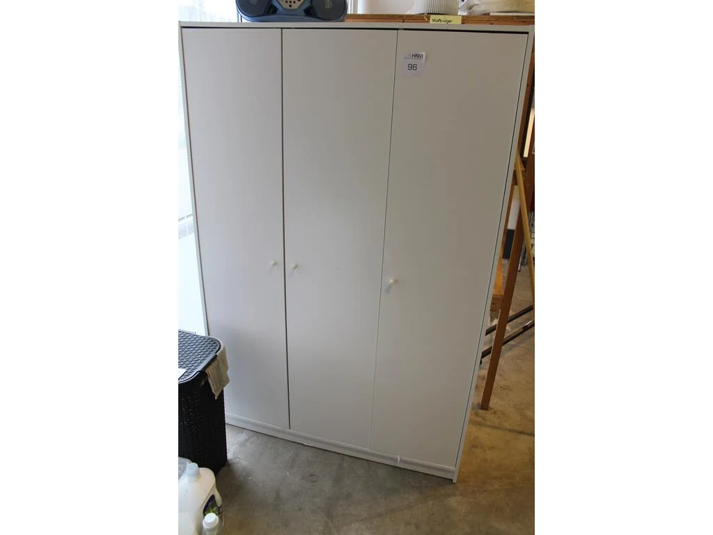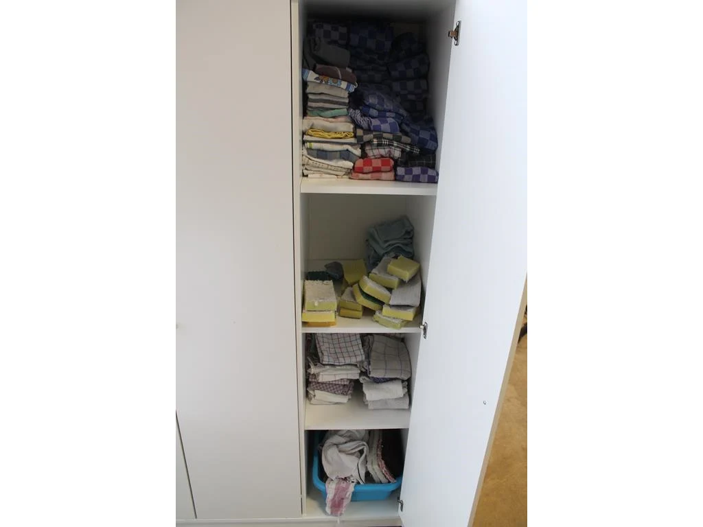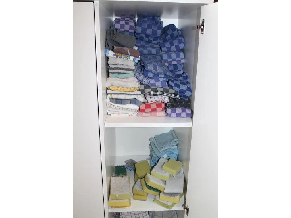 Schoonmaakproducten waaronder theedoeken, schuursponsen en moppen in kast.