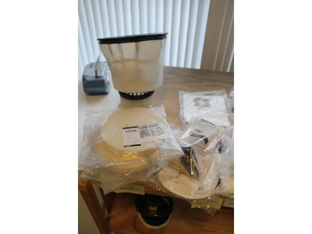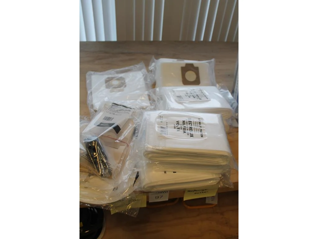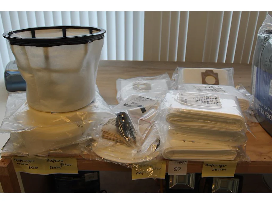 Stofzuigeronderdelen waaronder filters en zakken op schap.
