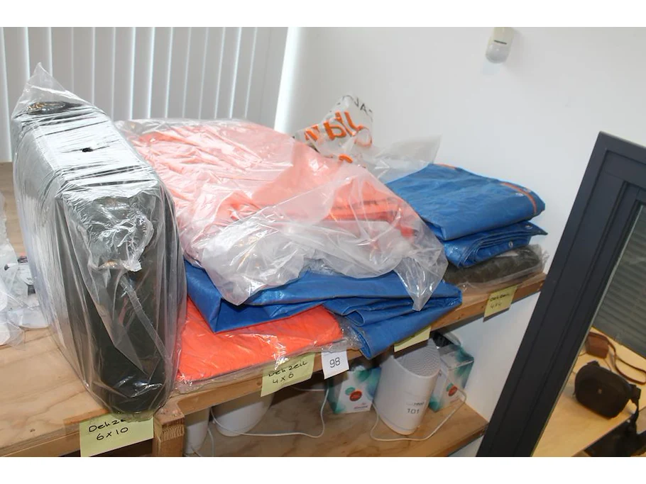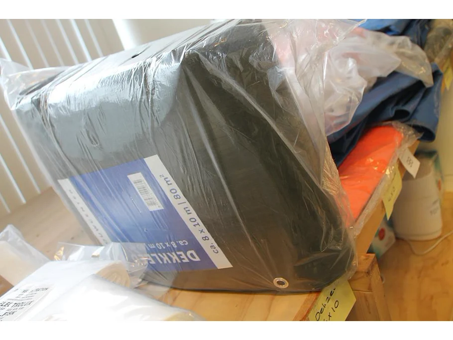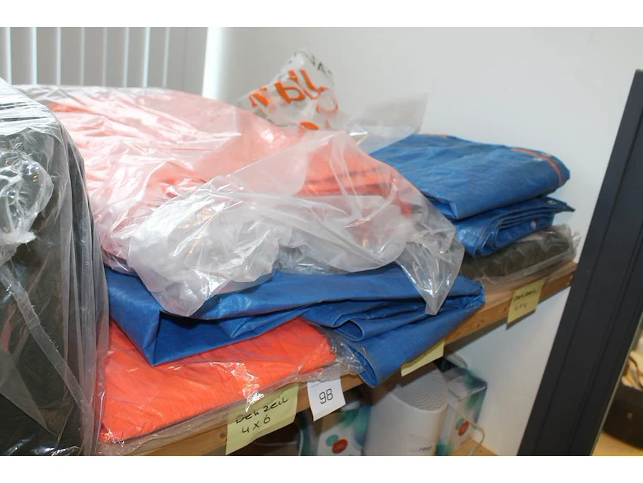 Zes dekzeilen waaronder 4 x 4 m, 6 x 4 m en 8 x 10 m op schap.