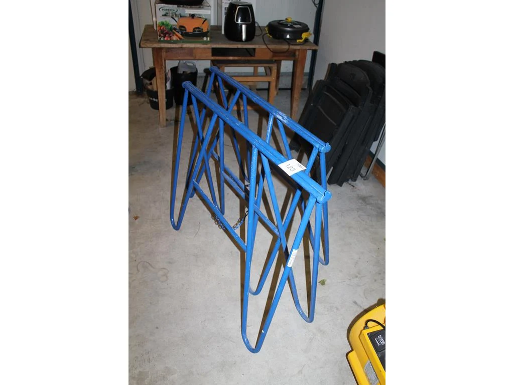 Twee metalen schragen met breedte 113 cm en hoogte 86 cm.