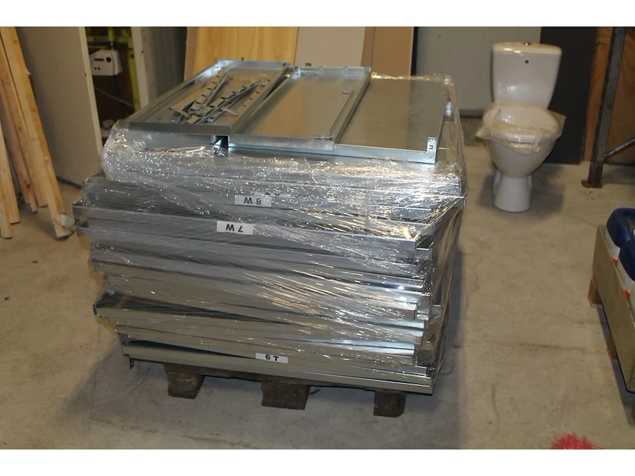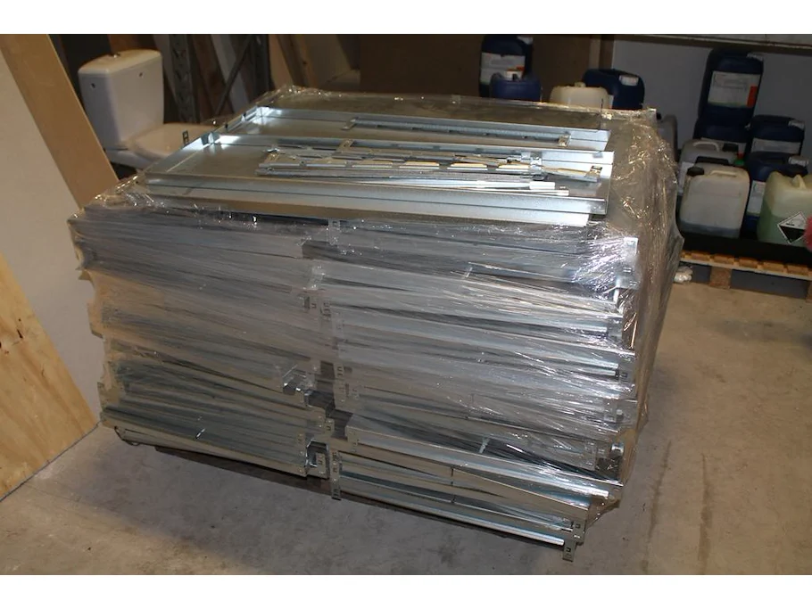 Gedemonteerde metalen magazijnstelling bestaande uit negen staanders met lengte 200 cm en circa 200 legborden 30 x 100 cm op twee pallets.