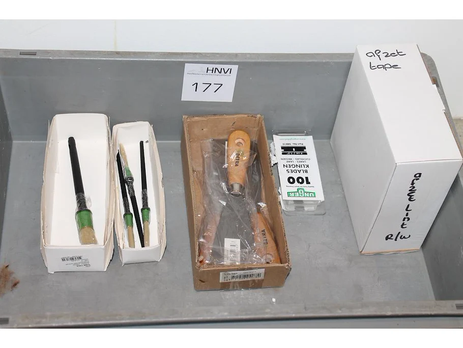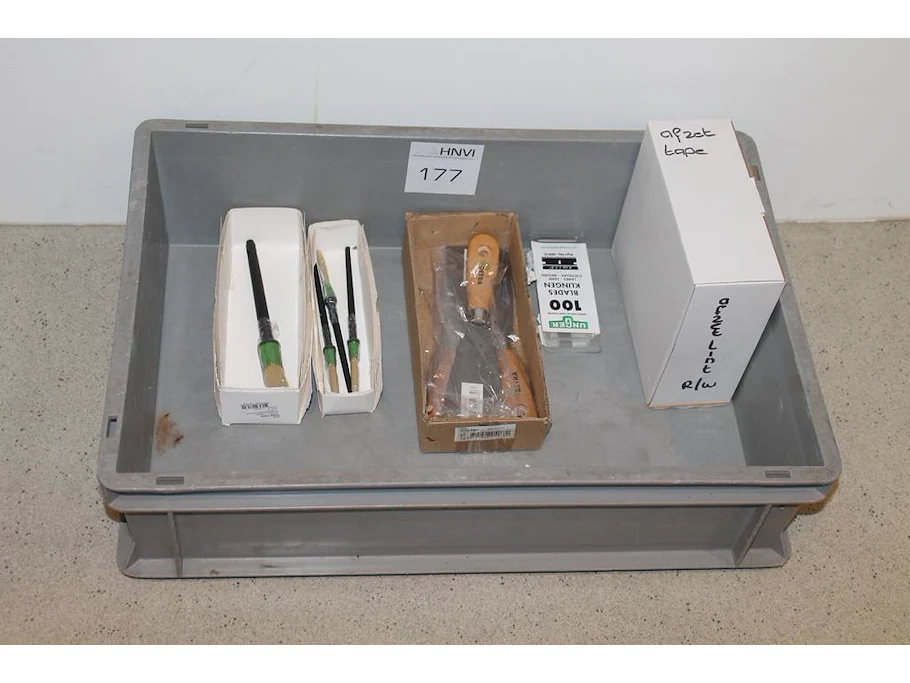 Afzetlint, mesjes, plamuurmessen en kwasten in kunststof krat.