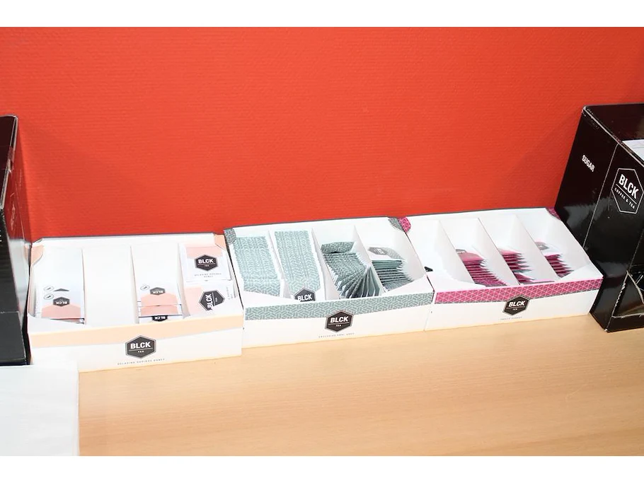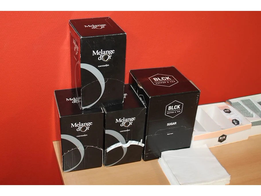 Koffie- en theeproducten waaronder suiker, creamer, roerstaafjes en diverse thee.