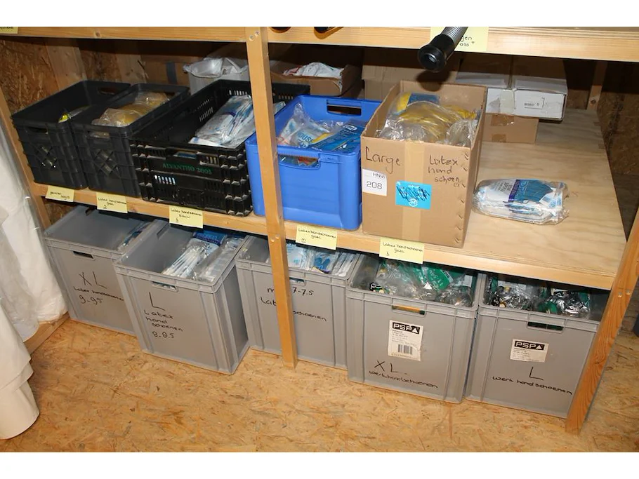 Latex- en werkhandschoenen in diverse maten en uitvoeringen in tien dozen en kratten.