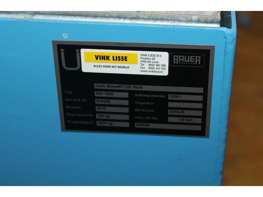 Chemieopvangbak BAUER AW1000 146 x 146 x 62 cm 180 kg met maximale belastbaarheid 1900 kg. Let op! Exclusief genummerde producten op de bak en afhalen na 12.30 uur.