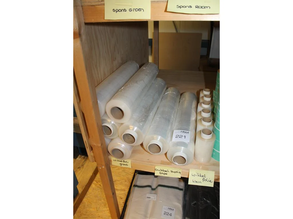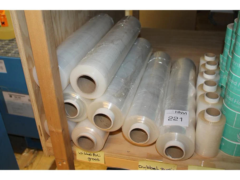 Acht rollen stretchfolie groot en zes rollen stretchfolie klein.