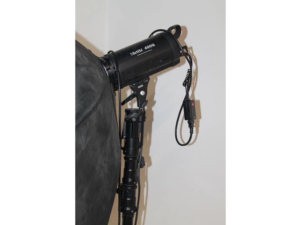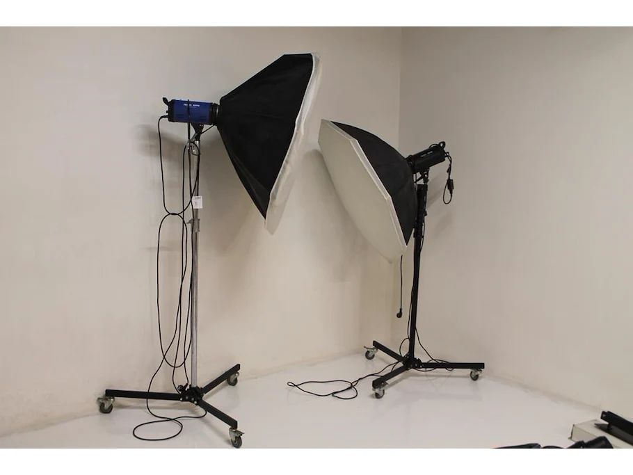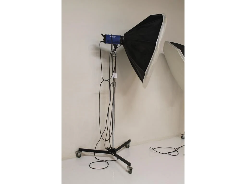 Twee studiolampen METTLE 400 Q met parapluboxen op statief.