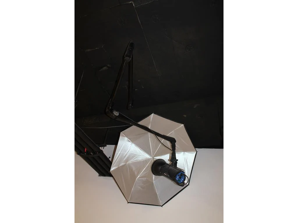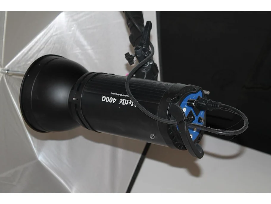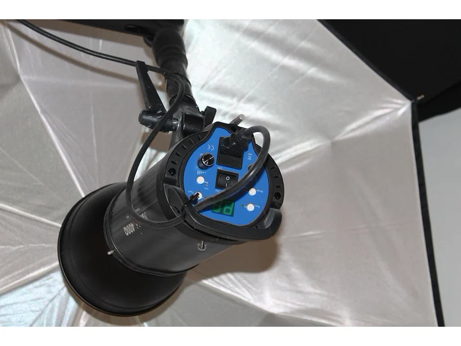 Twee studioflitsers mettle 200 en 400 q met paraplusoftboxen. plafondbeugels niet aanwezig