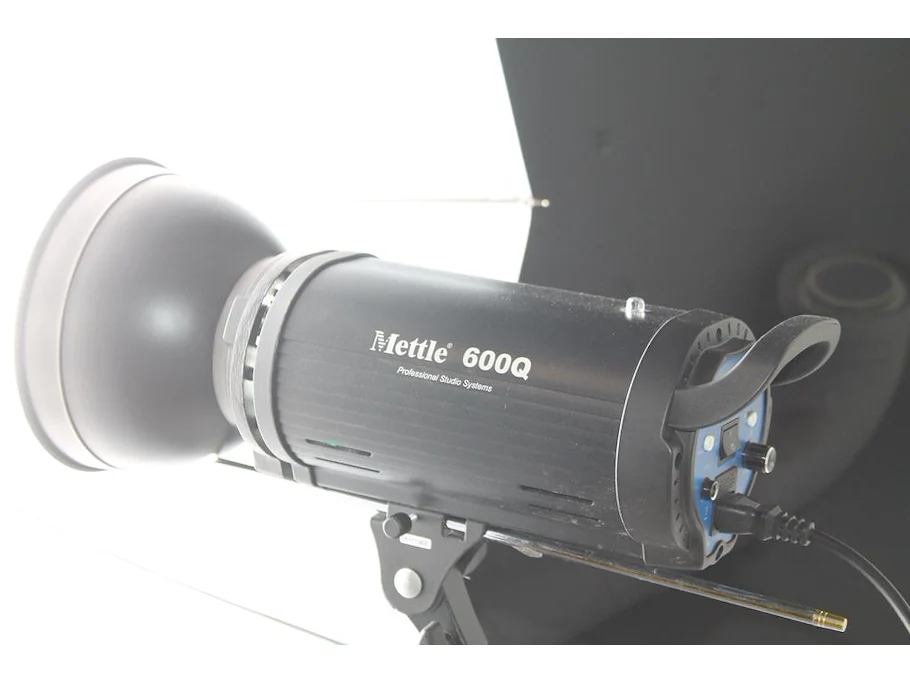 Twee studioflitsers METTLE 600 Q met paraplusoftboxen aan verstelbare FALCO EYES WB 1250 wallbomen
