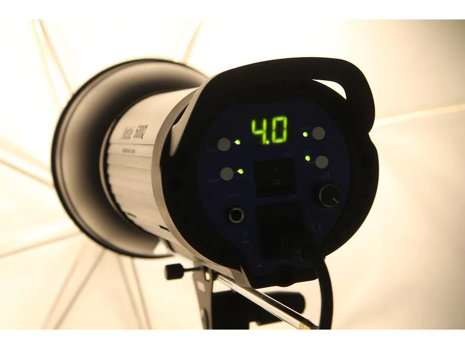 Twee studioflitsers mettle 600 q met paraplusoftboxen aan verstelbare falco eyes wb 1250 wallbomen