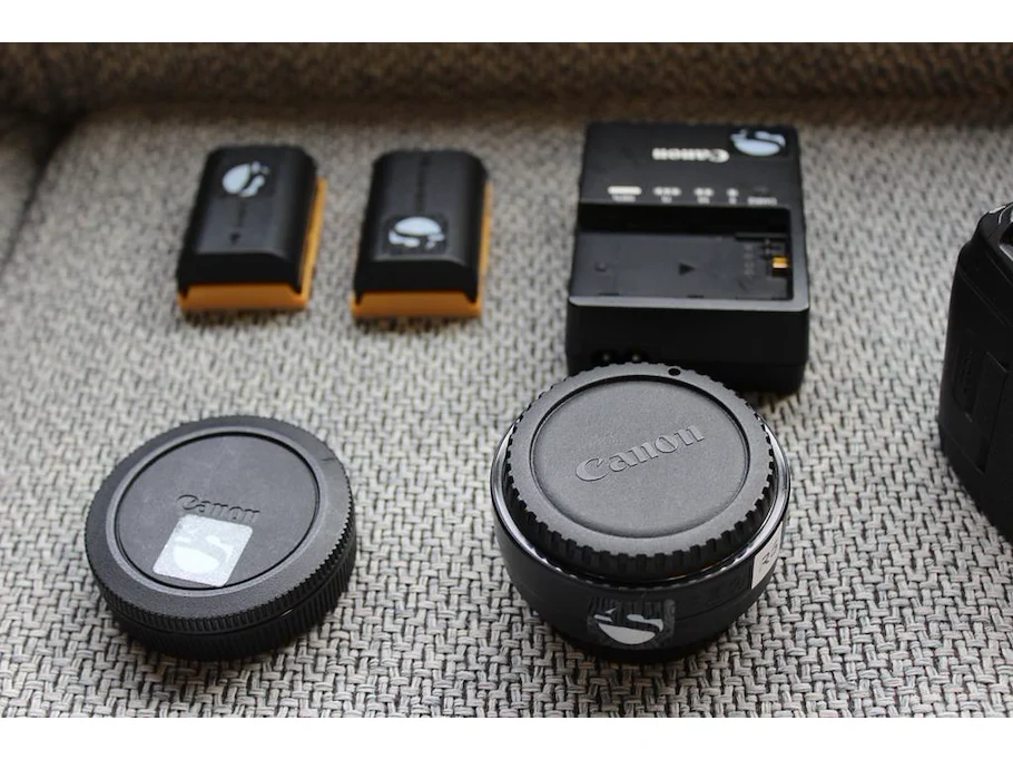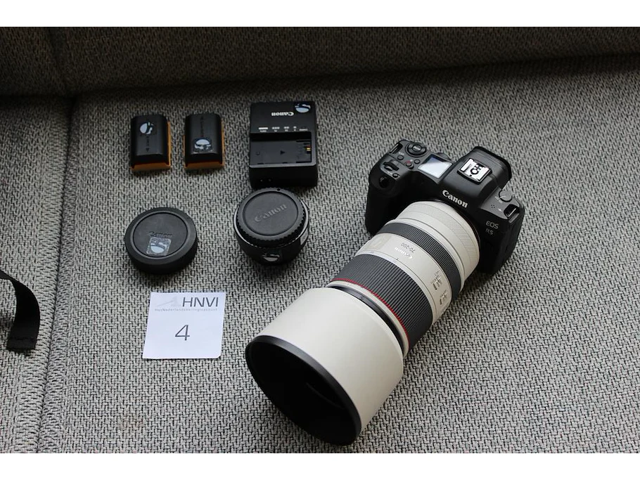 Full frame systeemcamera CANON EOS R5 voorzien van een CANON lens RF 70-200mm F2.8 L IS USM. Drie accu's en lader en CANON Mount adapter EF-EOS R in rugzak.