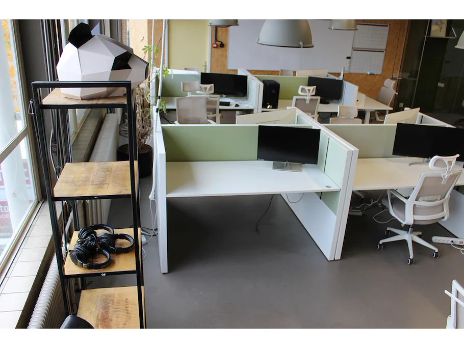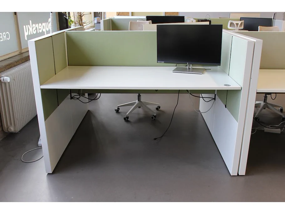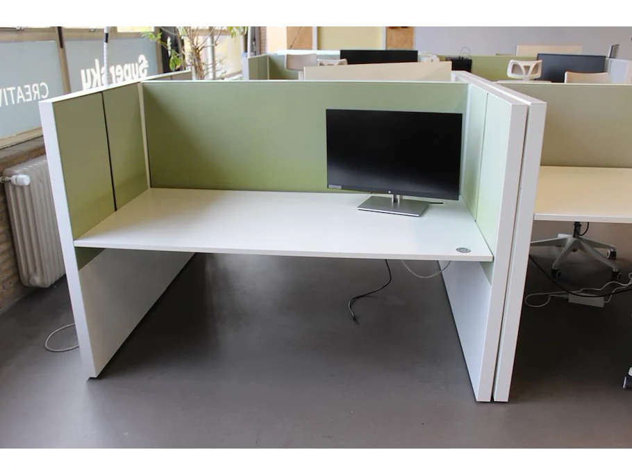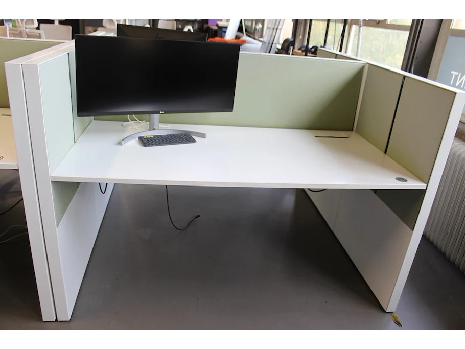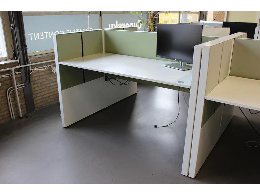 Dubbelzijdig elektrisch in hoogte verstelbaar bureau AHREND voorzien van akoestische panelen. Totale afmeting 172 x 170 x 120 cm. LET OP: onderdeel van combinatiekavel S016.