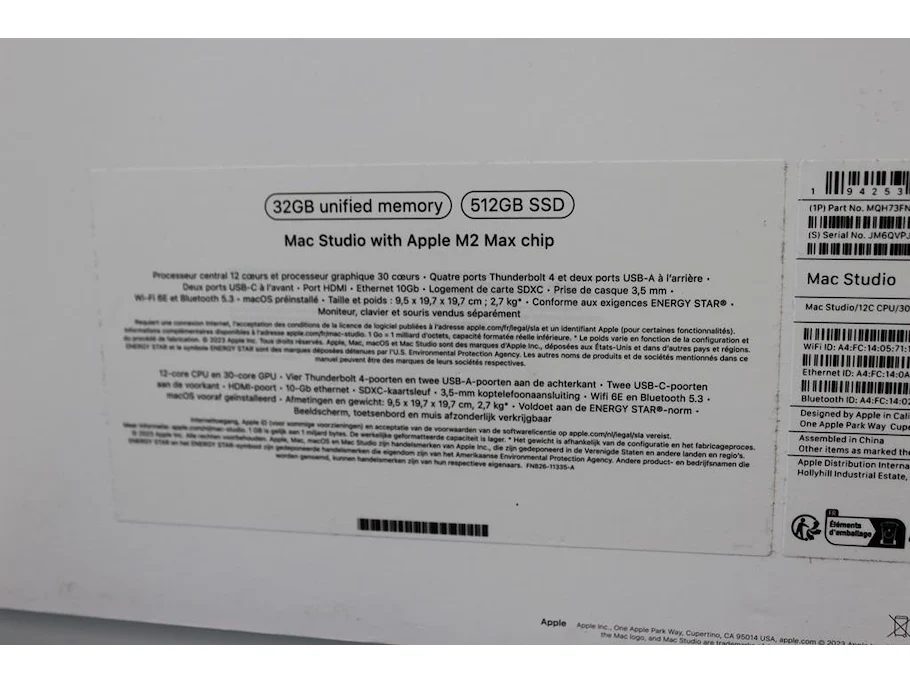 Mac studio met apple m2 chip geheugen mac os suqoia 15.6.1 32 gb 512 gb ssd 12c cpu en 30c gpu. model a2901.