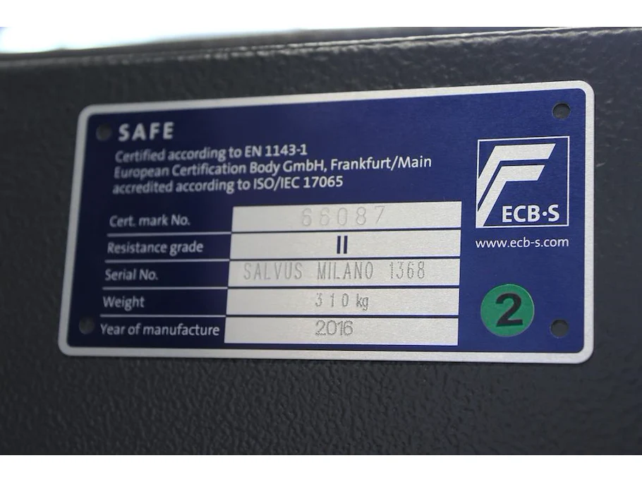 Kluis met cijferslot SALVUS Milano 1368. Bouwjaar 2016. Afmeting 68 x 51 x 132 cm. LET OP 310 KG, staat op eerste verdieping, lift aanwezig.