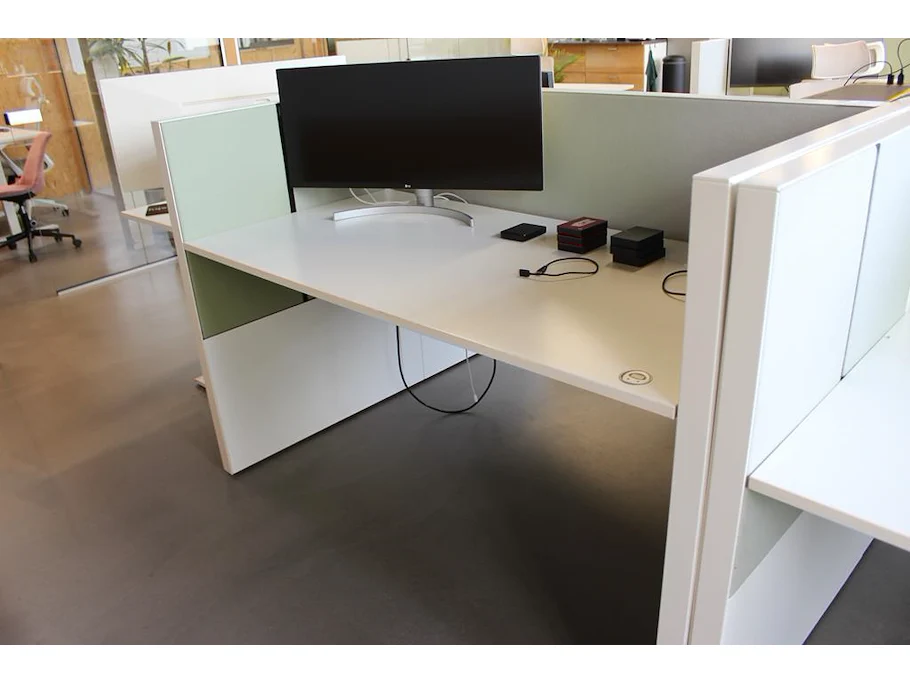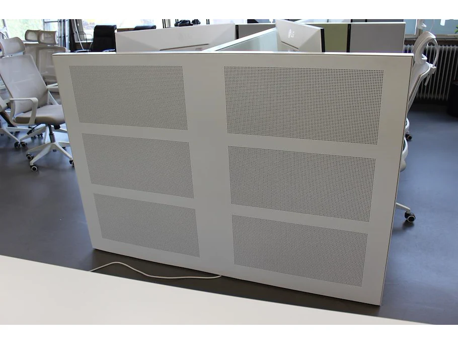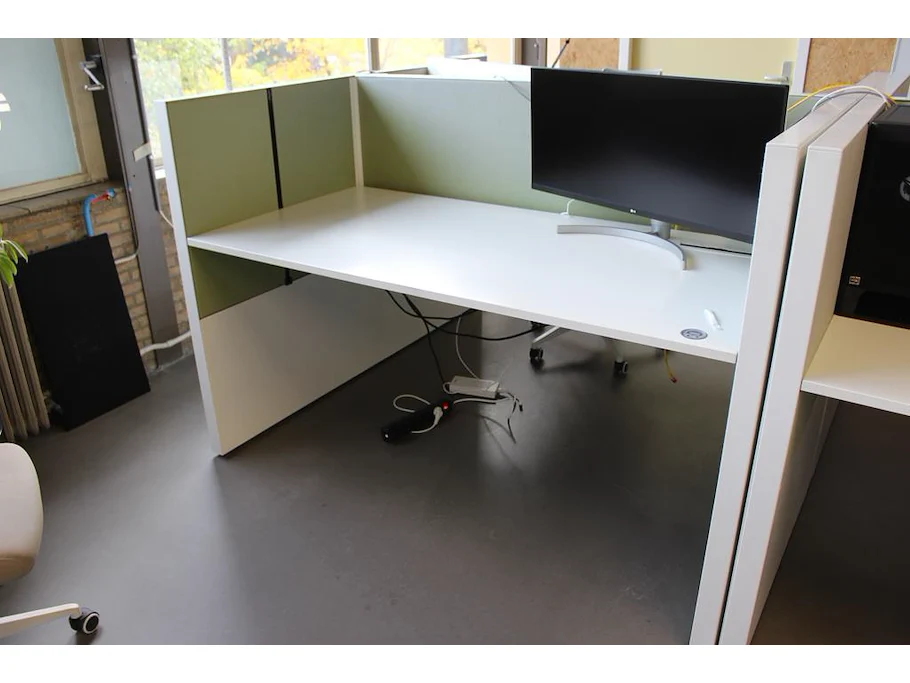 Dubbelzijdig elektrisch in hoogte verstelbaar bureau AHREND voorzien van akoestische panelen. Totale afmeting 172 x 170 x 120 cm. LET OP: onderdeel van combinatiekavel S016.