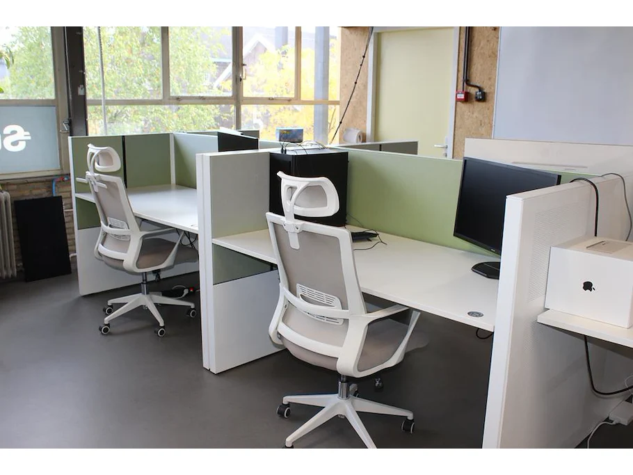 Combinatiekavel zijnde vier dubbelzijdige elektrische in hoogte verstelbare bureaus AHREND voorzien van akoestische panelen. Kavels S005 en S013 t/m S015